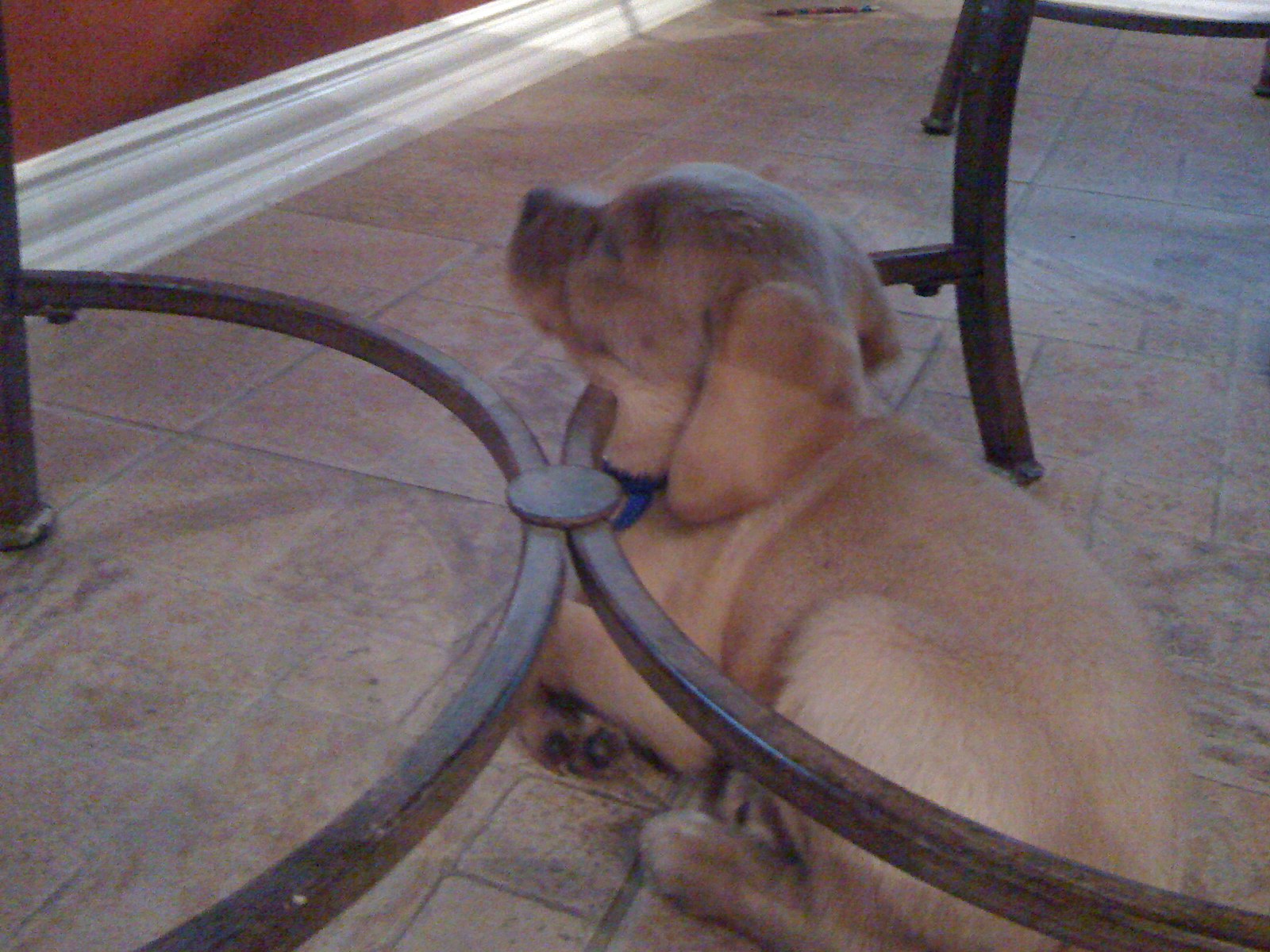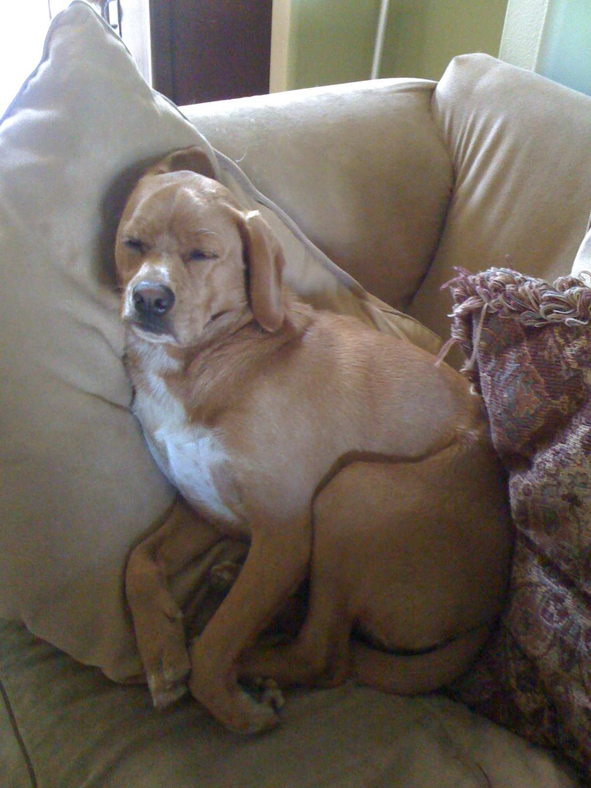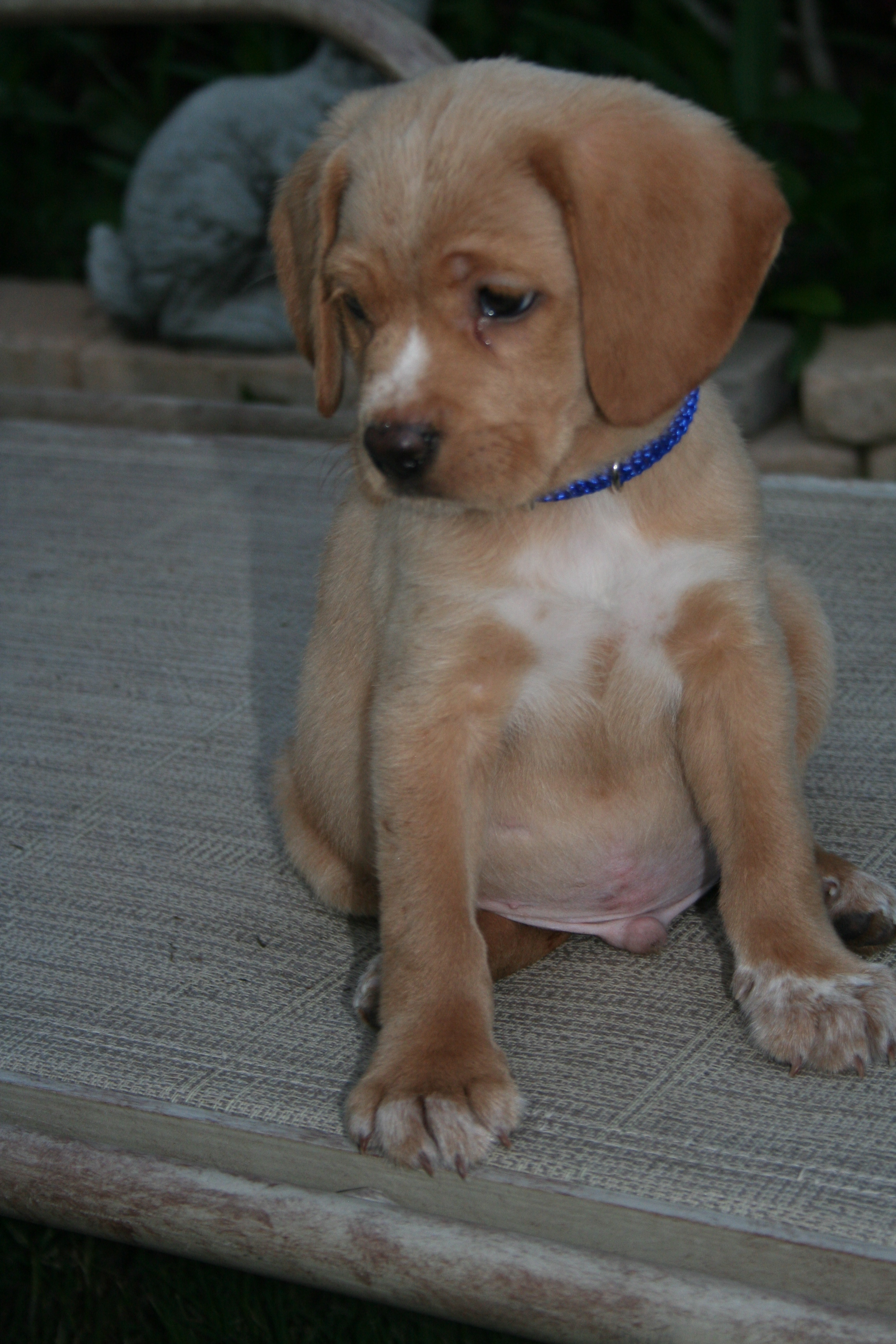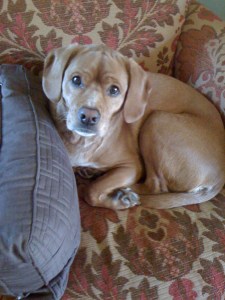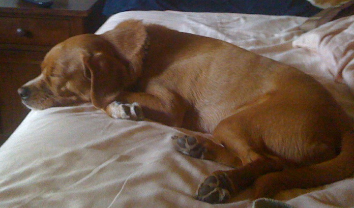 We don’t know what kind of dog he is, besides lazy & shiftless. Beagle, maybe? He has short, coarse hair; very different from the labs’ hair I’m used to. He has a very wrinkly brow and often looks quite contemplative. It’s mostly for show, though, because he sure doesn’t seem very smart.