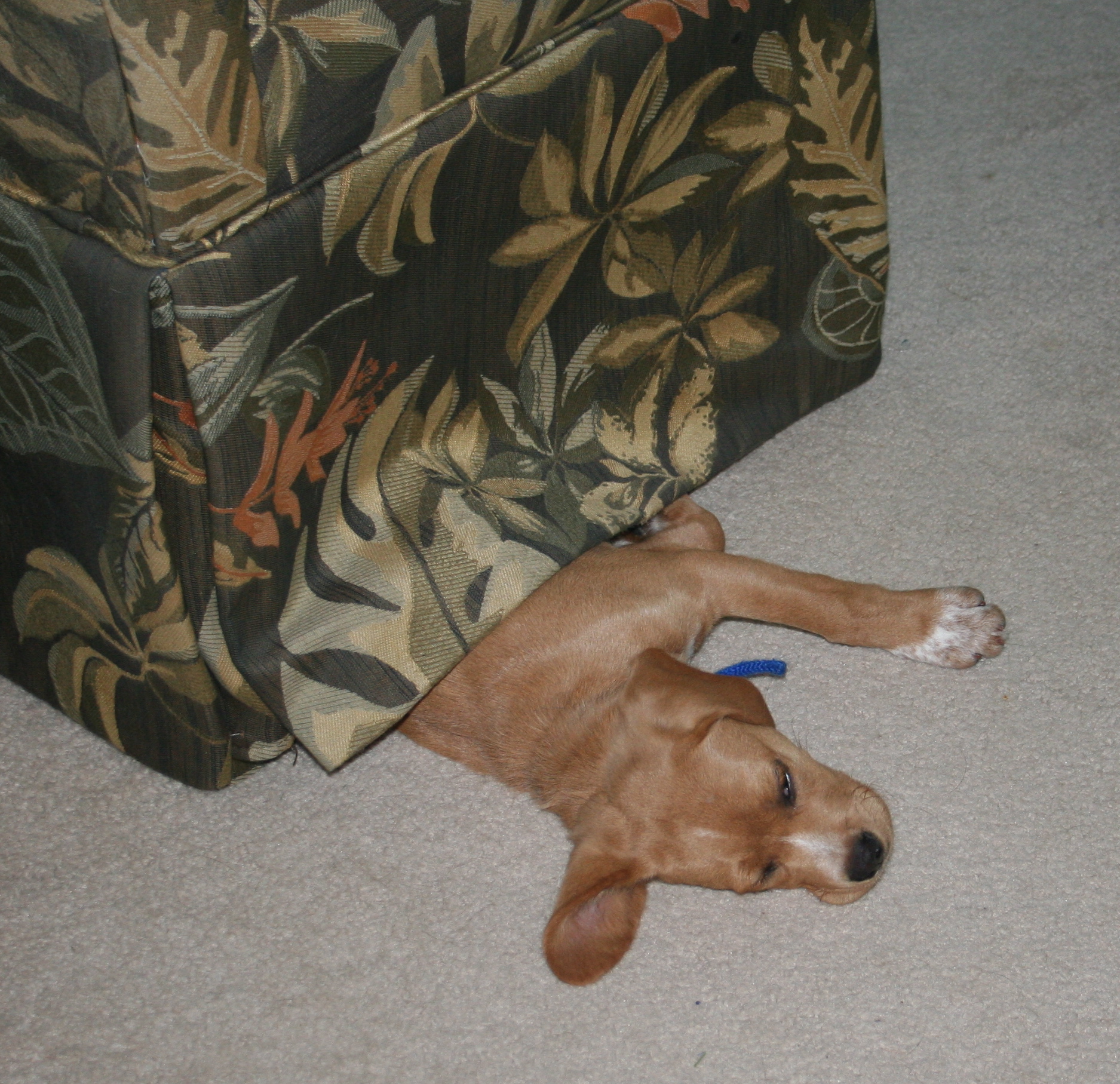 Sometimes his legs or tail peek out from underneath the chair, and sometimes he’s completely hidden and I forget he’s there until I scooch the chair back and accidentally scare him half to death.