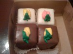 See, there’s this magical process called division. Non-math people like me tend to shy away from those kinds of processes, but I must admit, these processes can come in handy. Like when you want a little bit of chocolate and a little bit of vanilla. You take a knife and cut one of each of those delicious petit fours in half, and eat half of the chocolate and half of the vanilla. Or half of the vanilla and half of the chocolate. Either way. Just don’t be tempted to shove the entire half in your mouth at once. These are to be savored. Coming from a “hurry up, I wanted it yesterday” kind of girl, you know it’s true.