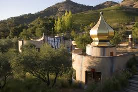 Hunterwasser’s goal in creating Quixote winery was to incorporate it into the existing terrain, and from the road, all you see is the golden turret on the far right. Mr H believed that a golden turret elevated man’s sense of self.
