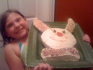 frosting tastes ok. He’s come a long way from the little guy in the striped t-shirt, trying so hard to balance as many eggs as his little mitts could gather. Macy is chief cake decorator now, and has had exclusive creative license over the bunny cake the last few years. The look of the cakes varies slightly over the years as Macy chooses the decorations.