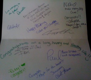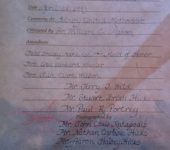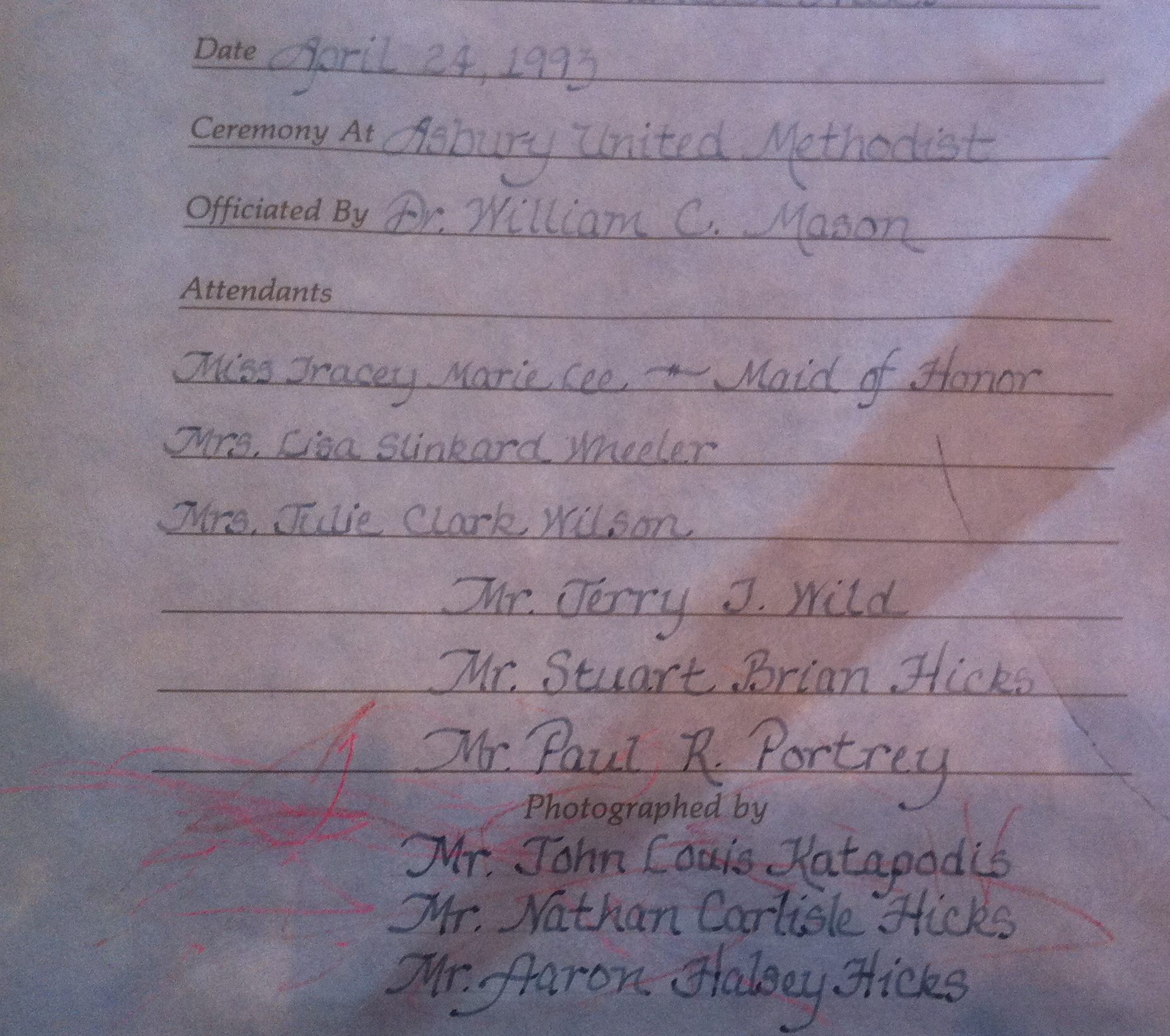 Here’s the title page of our wedding album, lovingly inscribed in by #1 neighbor and wedding coordinator Susan Postier. Notice the red and black scribbles? That would be Macy, as a toddler. She had an evil streak that incited her to leave her mark on everything from walls to brand-new furniture to wedding albums. Nothing was safe from the wrath of our pint-sized Pollock. Instead of being mad at her and thinking the album was ruined, I treasure it all the more because it has Macy’s signature on it. She wasn’t at the wedding, of course, and isn’t in any of the photos, but she made herself a part of it by stamping it with her signature scribble.