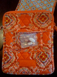 I will always be grateful to the sling bag for carrying my drains, and my drugs, in such style. The clear plastic compartment in the inside front is not likely designed for slipping in the essential few pills, but it sure worked well for me. I’ve heard that some people keep their driver’s license there instead. How weird is that?! Instead of my TX ID, featured here are my constant companions Bactrim & Minocycline, the antibiotics for the post-mastectomy infection; a muscle relaxer for the super-tight 17-inch belly incision; and a Xanax for any and all calamities, just in case.