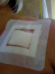 When my port is accessed, i.e., has a butterfly needle piercing my skin and the port to deliver medicine, it has to be covered to keep it sterile. The port itself is smaller than a quarter, and the butterfly needle (while really thick) doesn’t extend the area. Yet the whole thing has to be covered with this giant dressing. That’s it above, stuck to my clavicle, shoulder, and neck area. My skin hates these dressing with a passion. The sticky tape irritates my skin as much as Sarah Palin irritates me. After I peel the dressing off, there remains a red, raised outline in the exact size & shape of the dressing.