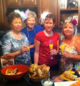 The ladies sported fascinator hats popularized by the new Duchess of Cambridge. Seems fascinators have become all the rage since the ever-fashionable Kate favors them. Mine was the lamest one at the watch party, because it was a last-minute addition to my garden-party frock and in the interest of full-disclosure, is a clip-on flower belonging to Macy. I grabbed that out of Macy’s hair-art drawer right before the party started rather than fashioning a fascinator out of feathers, as our guests did. Jill’s mom, Joan (visiting from St. Louis) and my mother-in-law, Jody (visiting from Kentucky) had grey and lilac feathers respectively. Jill’s was blush pink, and all were lovely.