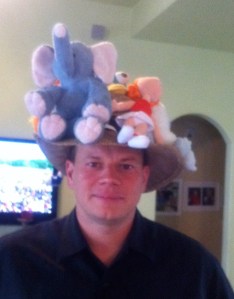 Embracing the royal occasion and tradition of “frivolous, oversized hats,” Keith came up with the mother of all hats. Whimsically created with found objects, this inspiring chapeau featured a jaunty elephant, which provided the height so desired in an outlandish hat. Candace from “Phineas and Ferb” contributed a nice diagonal line and bolt of bright red. The one lone eyeball from an unseen creature in the center of the hat sends a playful yet contemplative message.