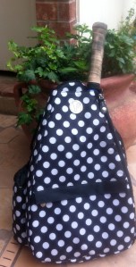 Sadly, it had been consigned to the garage instead of riding shotgun like normal, and it hung on a hook, quite forlornly, I might add, all this time. Over the course of almost 3 months, things like stadium seats and insulated cooler bags were hung in front of my beloved bag, and it took on the role of wallflower instead of constant companion. I had to take my racquet out, just for a sec, and hold it in my hand. Just like old times.