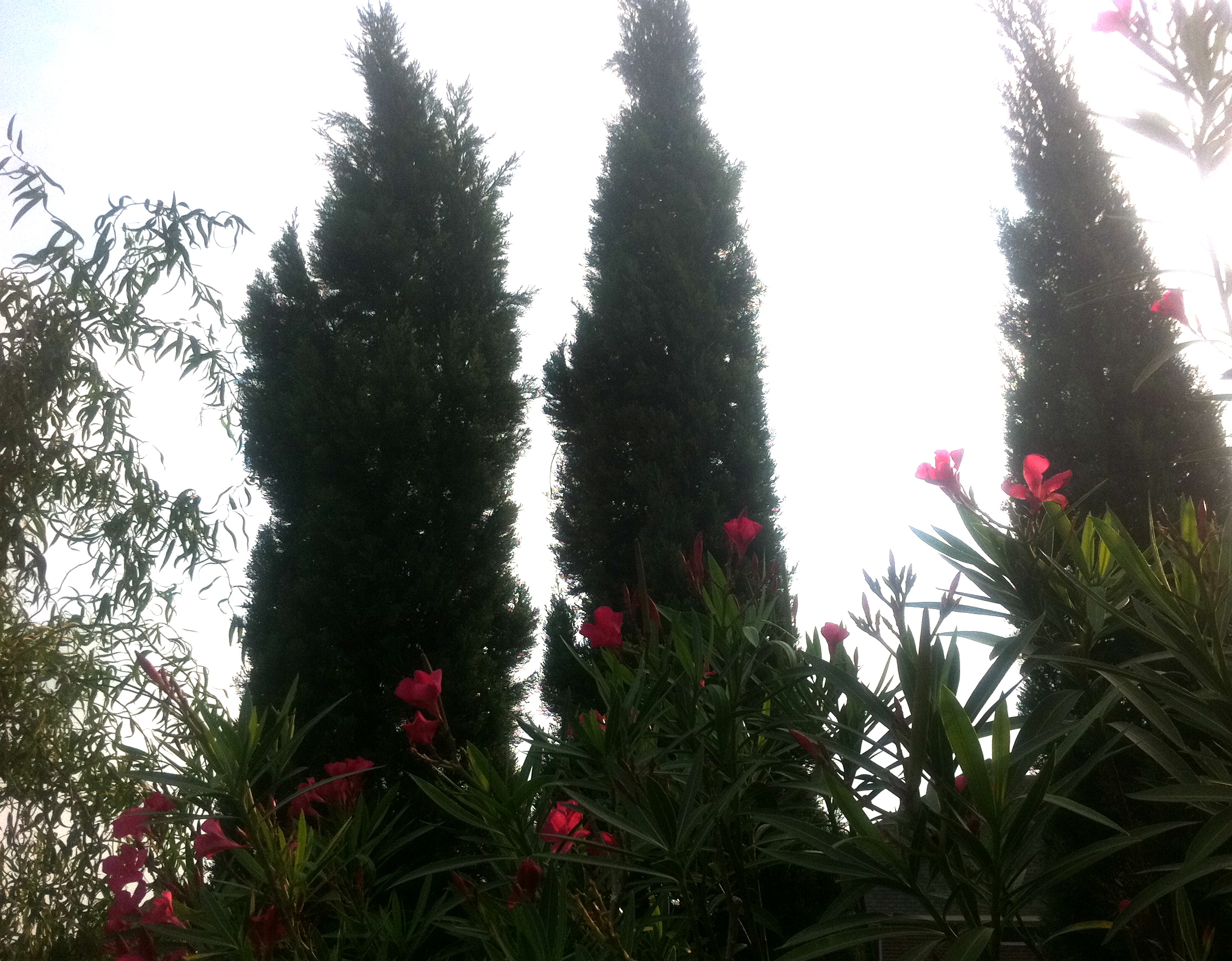 I suspect those babies have grown up and left the nest, as it happens quickly in the bird community. I haven’t heard the sweet little peeps in several weeks, nor have I seen parental bird figures flitting in and out of the cypress to care for their young. The only evidence that the fledgling family was even there is the one long string, raffia-like, that must have been used in the nest-building process. It sticks out of the cypress about 8 inches, and while I always assumed it was leftover building material, it strikes me now that perhaps the industrious nest-builders placed it there on purpose, to make it easier to find the nest from outside. The 3 cypress trees along the fence are identical in appearance, and the nest was buried deep within, not at all visible from the outside. Perhaps the momma bird told the daddy bird to leave a piece visible from the outside so they’d never have to stop for directions.