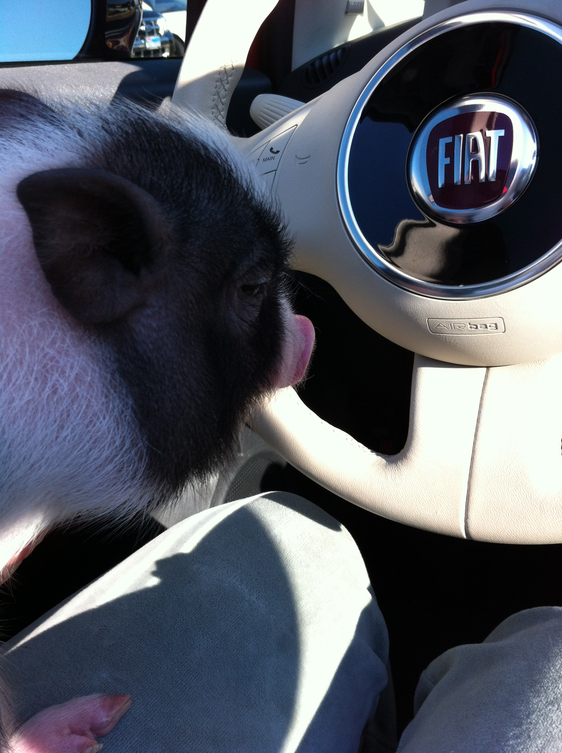 DOES SHE LIKE TO RIDE IN THE CAR? As long as she’s in my lap. I’m sure the sensible thing would be to put her in her crate for car rides, but she’s more of a lap-pig than a crated pig.