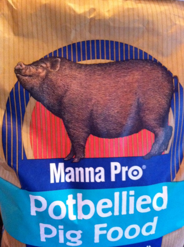 WHAT DOES SHE EAT? Pretty much anything. We bought pot-bellied pig food in a 25-lb bag at a feed store. Prices are comparable to dog food. I’ve never had a cat, so I can’t speak to how pig chow compares to cat food price wise.