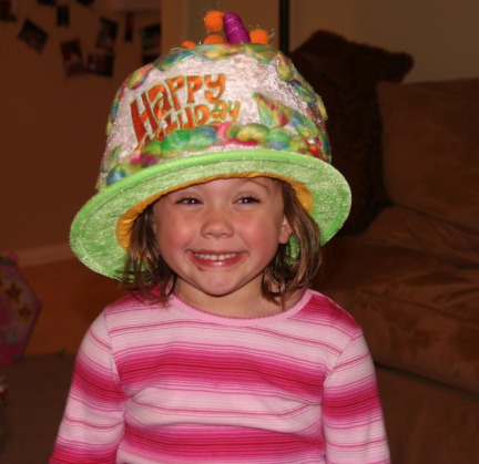 The birthday girl with her party-hatted pig. This, my friends, is what life is all about. A girl. A pig. A hat. A party. Good stuff.