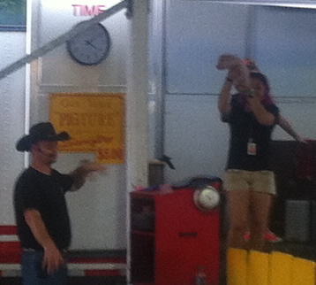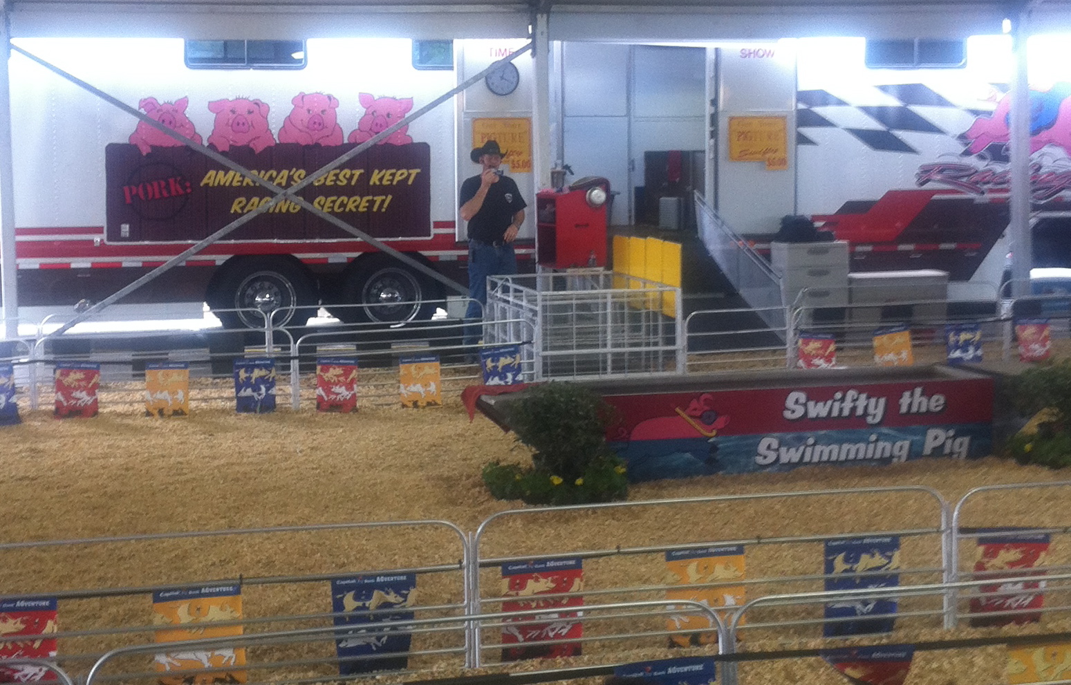 Our emcee. What a gig, right? Calling the pig races every hour on the hour, every day for 18 days.