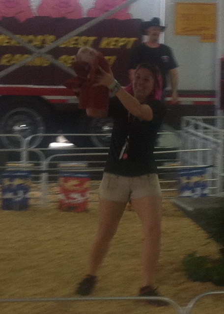 The girls in the black t-shirts escorted the piggie racers to their gates. I know the pictures aren’t great, so just focus on the little pink blob coming down the ramp, just underneath the first girl’s hand.