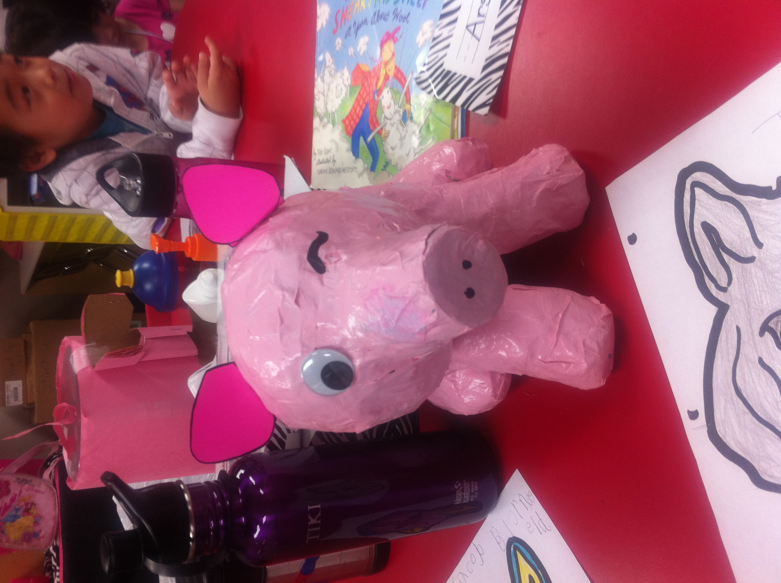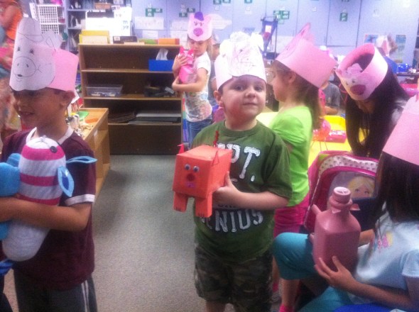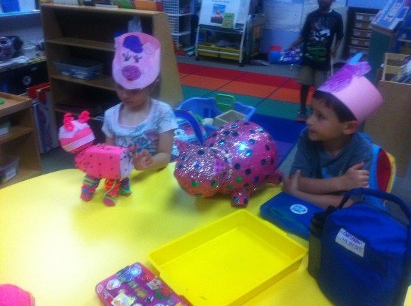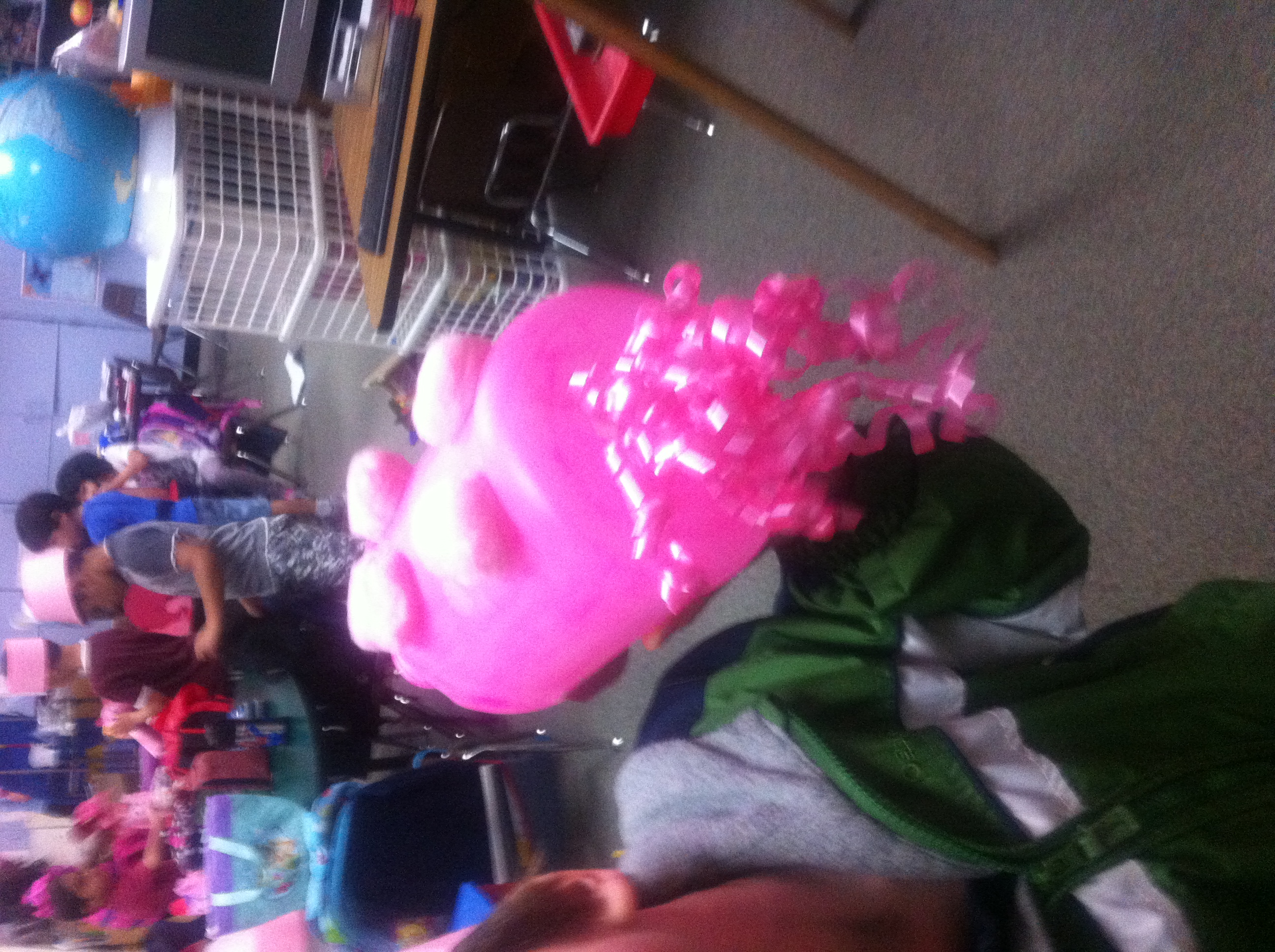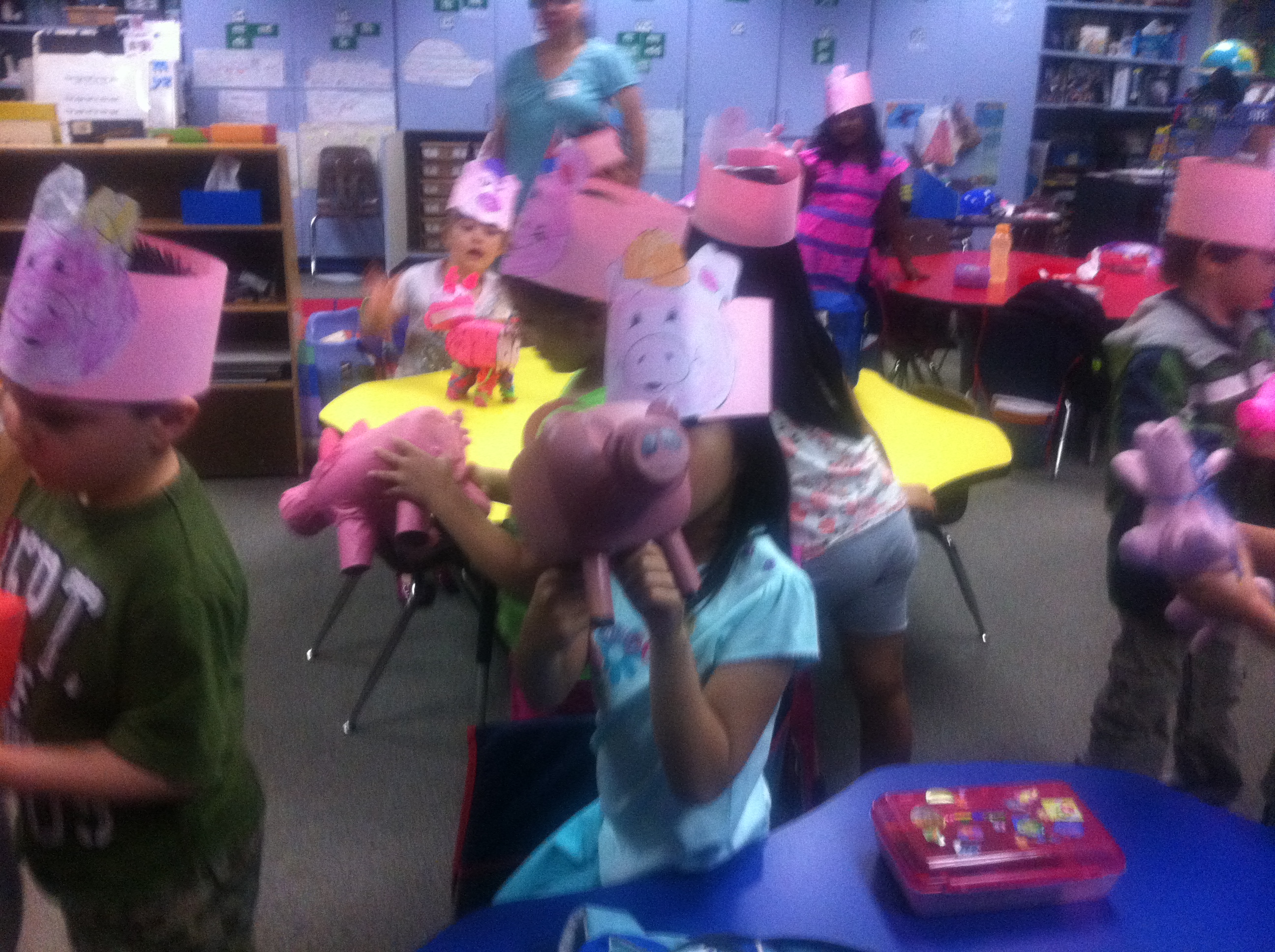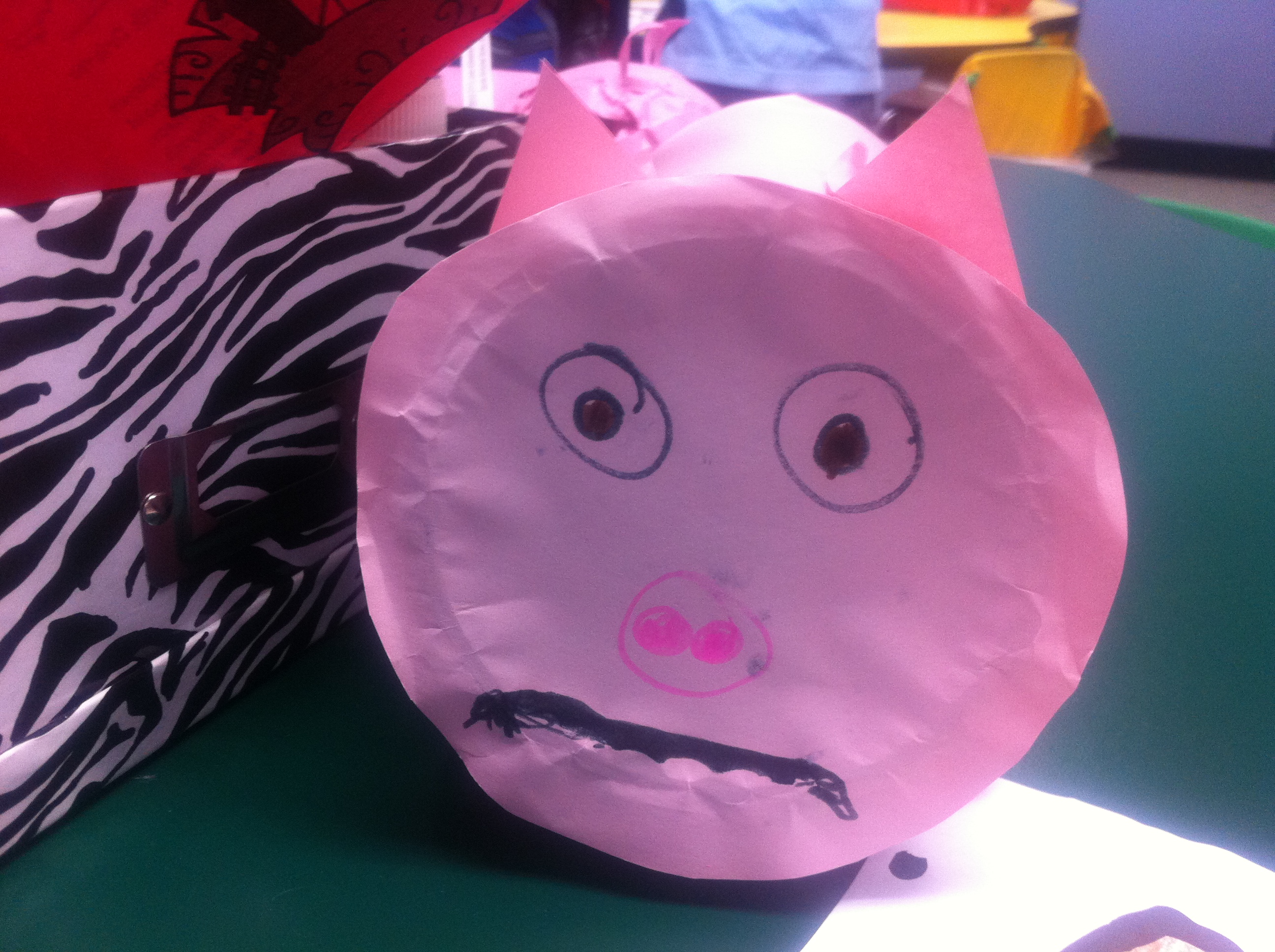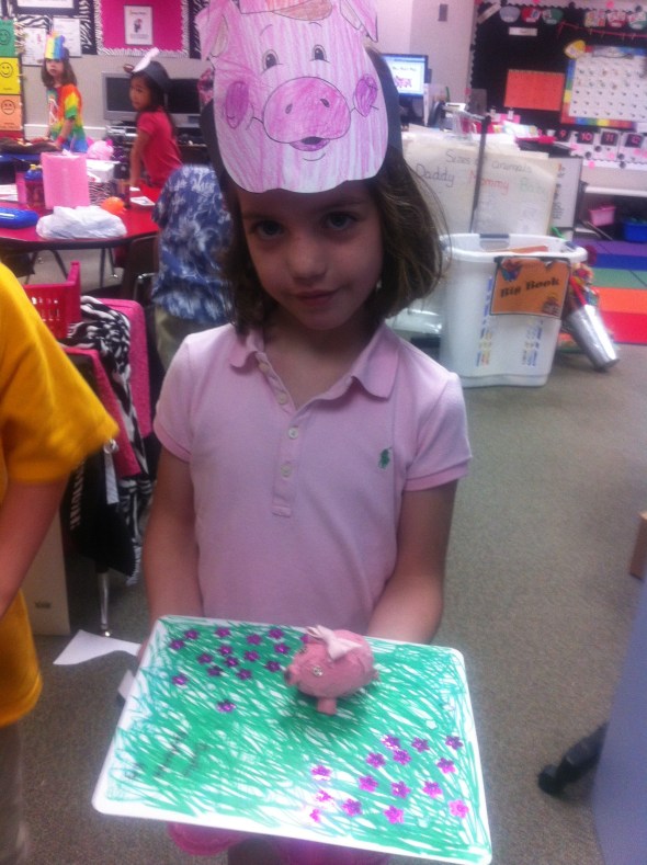 So the deal is that every year, the kindergarten classes at our school have an at-home project to create a pig. Once everyone has created their porcine masterpieces, the piggie projects are carted up to school and the kindergarteners parade through the entire school carrying their creations while the rest of the school gazes appreciatively from a seated position in the hallway. Every single one of the kids in grades 1 through 5 sit in the hallway in a single-file line and watch the kinder kids proudly walk by with their pigs.