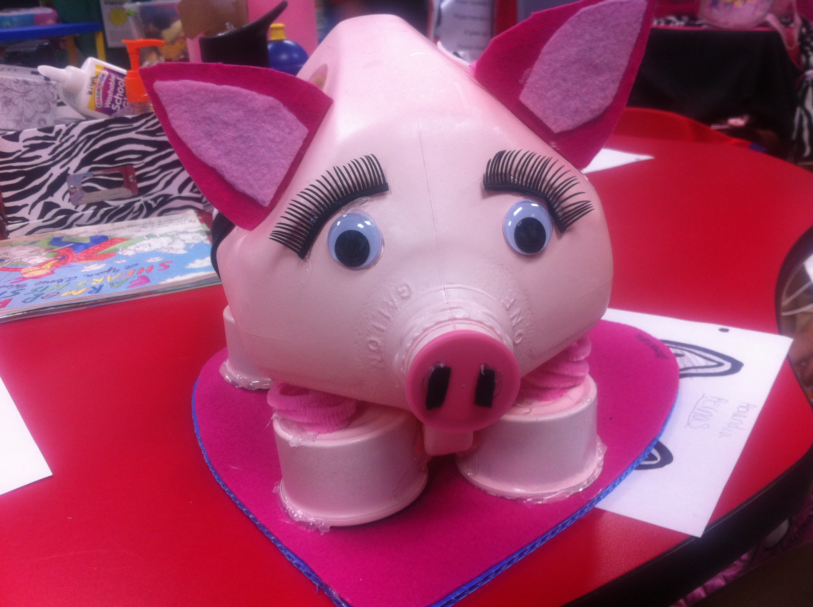 When it was Macy’s turn to take on this project, nothing could have tickled her more. She’s been a pig-lover her whole life, so having the chance to make and present a piggie was her idea of heaven. Being the queen of accessories, she gave her pig big hoop earrings and giant kissy lips.