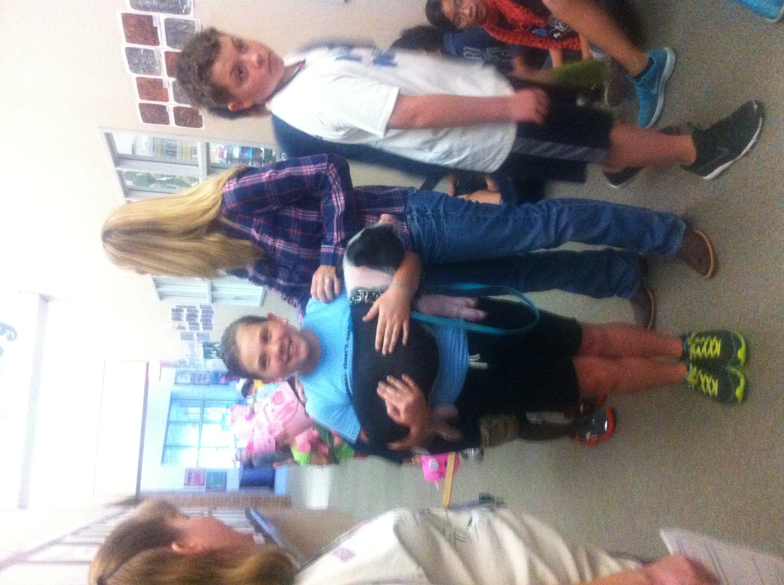The parade meandered by each grade’s hallway, with our little piggie leading the way. Macy carried her most of the way, and yes she is a bit of a load. Our little piggie walked some on her leash, but made too many unscheduled stops to sniff and root at the carpet. She also proved to be a bit too tempting for some of the audience members to resist, and more than once a pair of small hands reached out to touch her before being reprimanded by the sharp-eyed teachers.