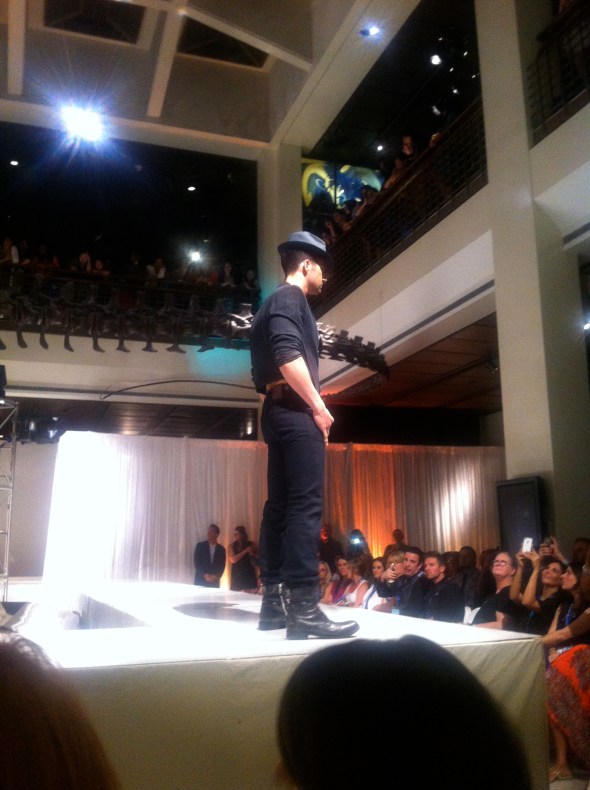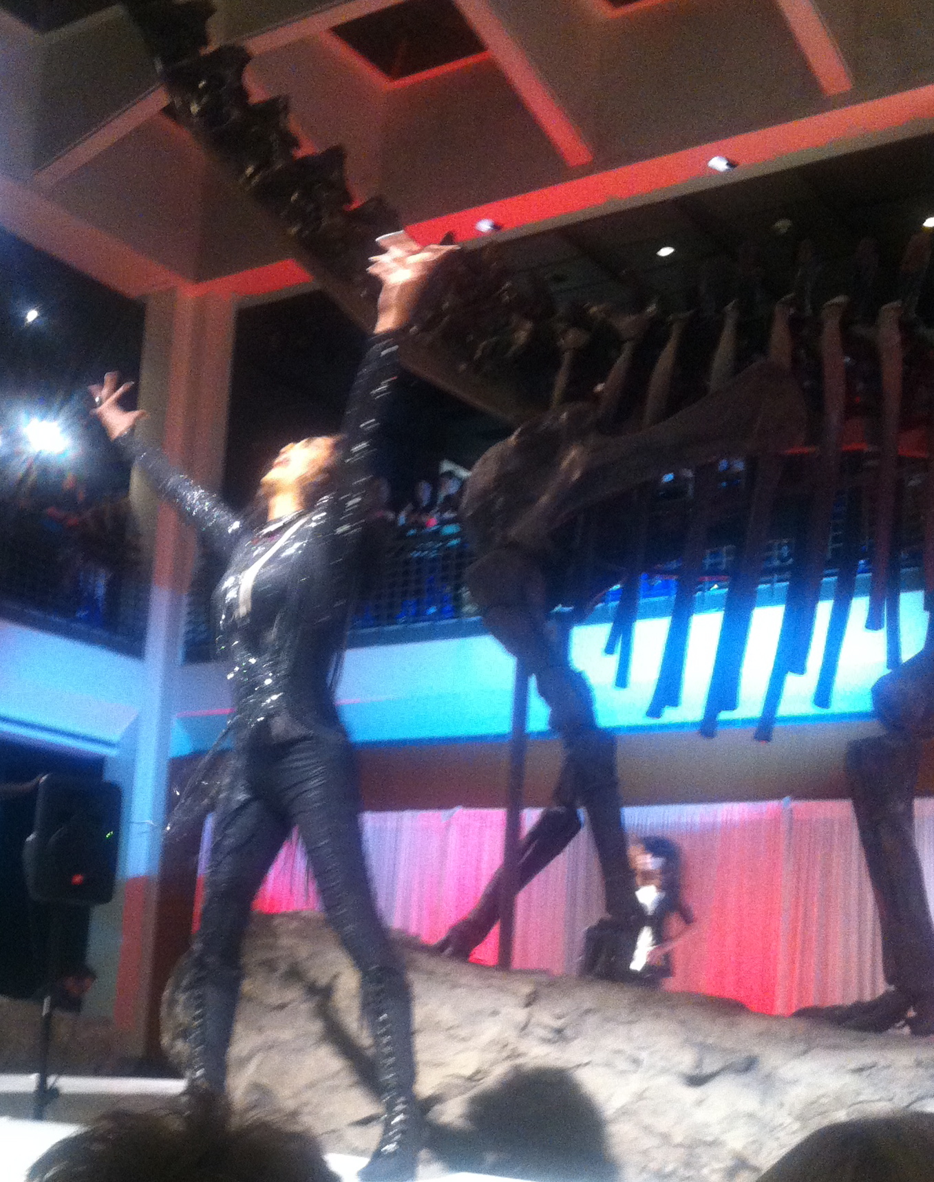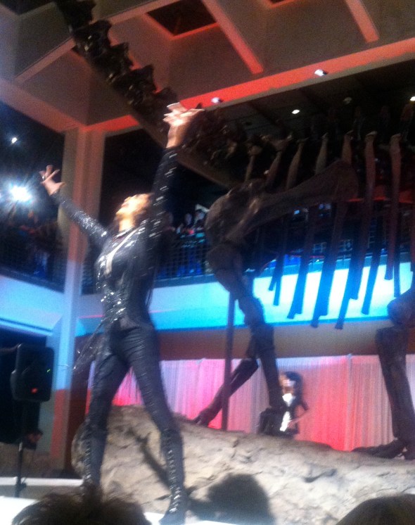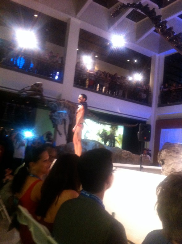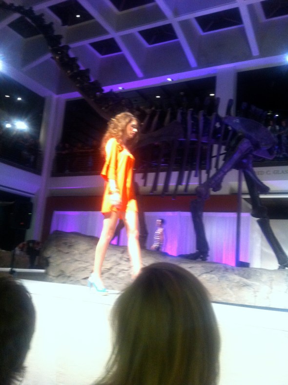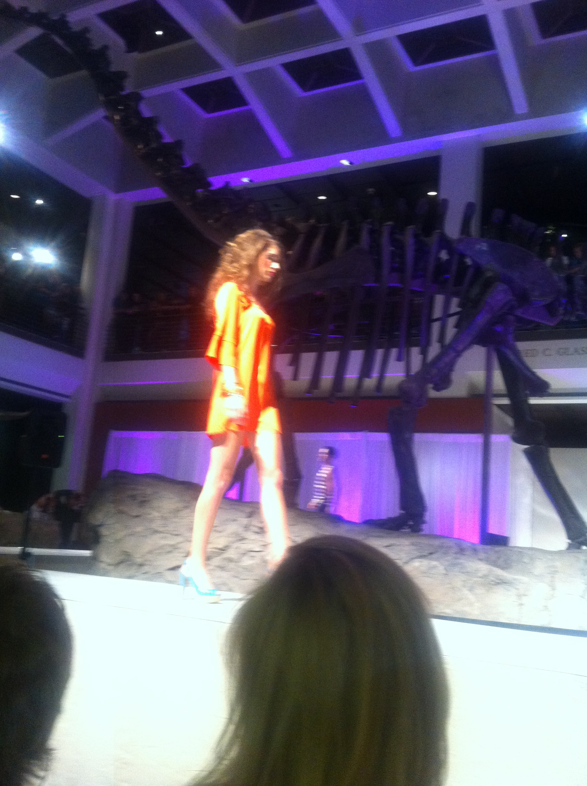 Being a recent fashion show model myself, it was so fun to watch the pros do their thing. The runway was in the Hall of Paleontology of the museum, and the catwalk was built to encircle the dino bones. Cool.