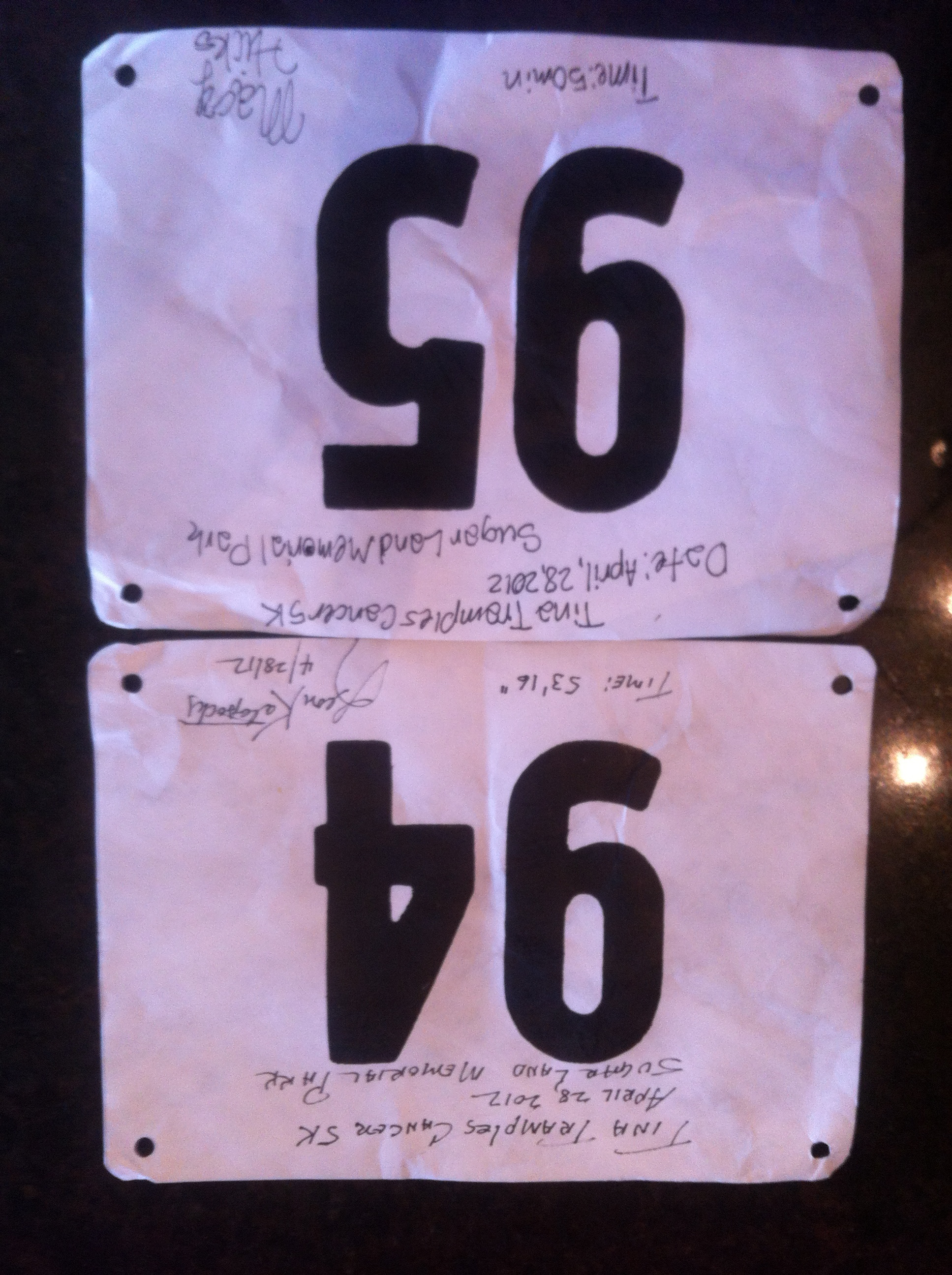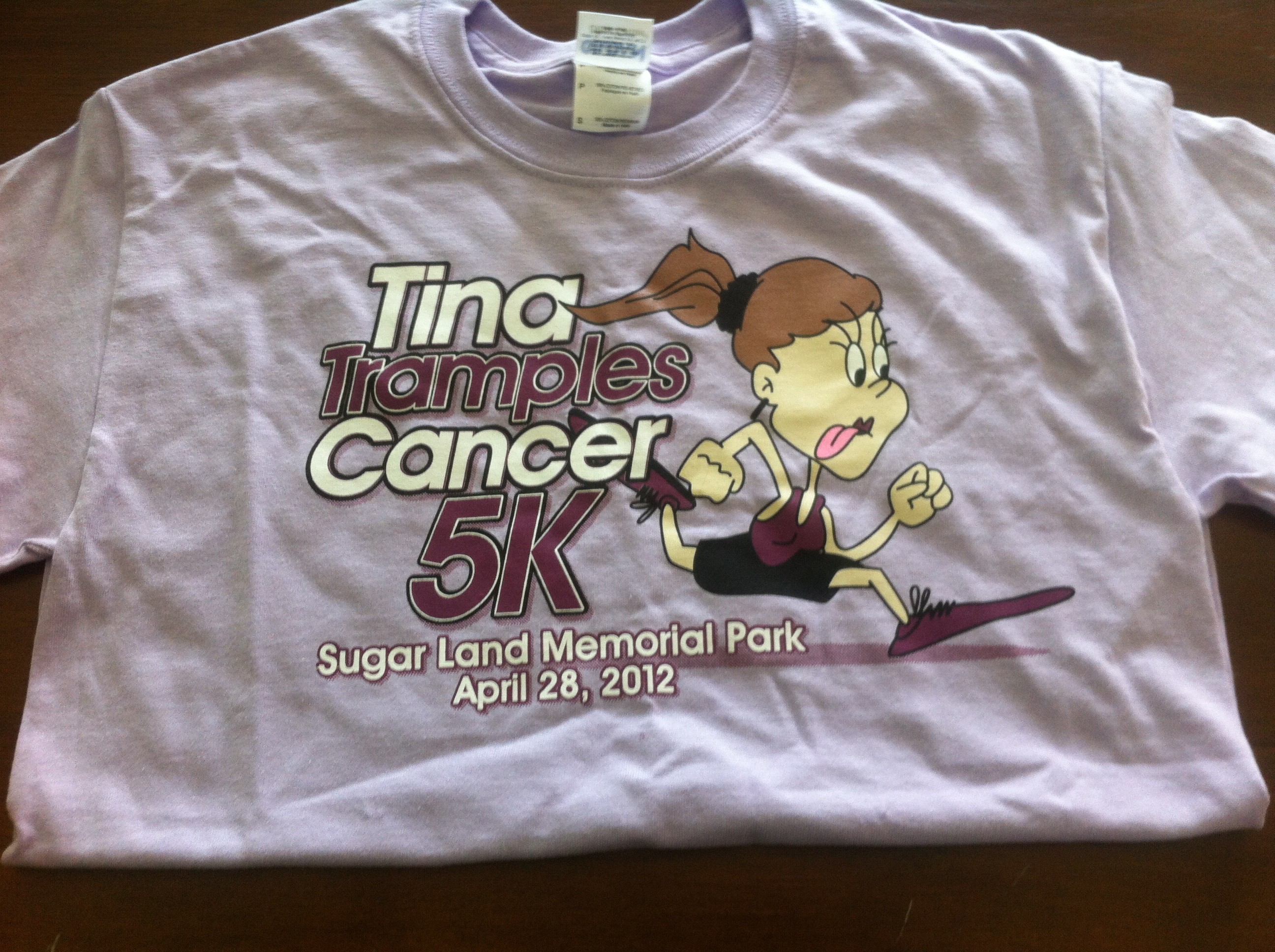 Posted: April 28, 2012 Filed under: Uncategorized | Tags: 5K race, cancer fundraisers, family fun run, getting life back after cancer, life after cancer diagnosis, pancreatic cancer, Pancreatica, Sugar Land Memorial Park, Tina Tramples Cancer 14 CommentsJust one day after my 2-year cancer-versary I had the extreme pleasure of participating in an uplifting, enriching event. The Tina Tramples Cancer 5K race was such a great time I’m still smiling about it. Did I take one photo? No. So please use your imagination. I had every intention of taking pics, but it was rather dark at 5 a.m. when I arrived with scores of other volunteers, and by the time dawn broke, we were too busy setting up tables, registering runners, and getting the race off the ground.