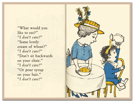 Sendak’s characters have been described as bossy, headstrong, and borderline obnoxious. Perhaps that’s why I like them so. In Pierre, the title character is a stubborn boy whose stock reply to everything is “I don’t care.”