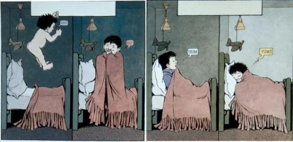 Similarly, I cherish my copy of In the Night Kitchen. Not because it’s as special to me as Pierre and Little Bear; frankly, the story never grabbed me like the others did. It’s precious to me, though, because of the controversy surrounding main character Mickey’s nudity. Librarians were known to draw a tiny diaper on little Mickey’s bum to cover his nudie-bits. The book was subsequently banned and roundly criticized, which of course made it all the more appealing to me. Betcha the closed-minded book-banners would really get riled up if they knew that Mr Sendak lived an alternative lifestyle. Not that it’s anyone’s business. Long live Mickey and the Night Kitchen. “Stir it! Scrape it! Make it! Bake it!”