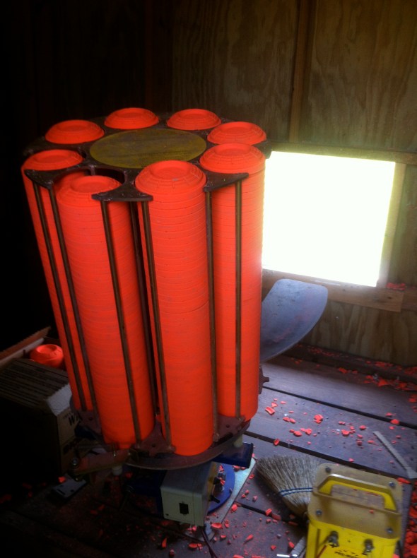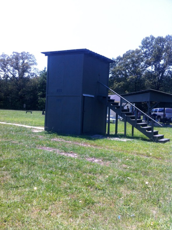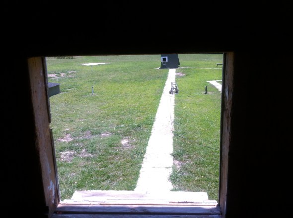 Once they’re all loaded onto the dealy-bob, you can shoot away to your heart’s content. I took a quick peek out the window of the “high house” to get a bird’s eye view. Or a clay piegeon’s view, as it were.