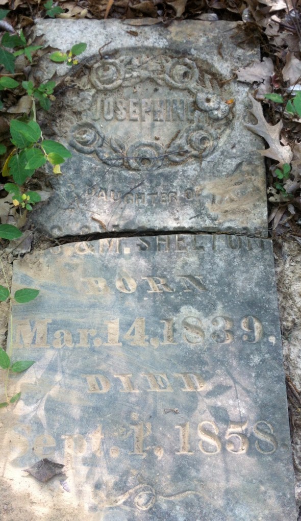 Listening to Amy tell me about Josephine while I endured yet another night on scratchy hospital sheets fighting that dadgum post-mastectomy infection was a memorable escape during a time of hardship. It’s the story of a young girl who lived and worked on the Shelton Plantation in the mid-1800s, which is now the site of Gina’s beautiful home and acres of beautiful woods. It’s believed that Josephine’s father was the plantation owner and her mother was a slave. Deep in the woods lies this grave marker.