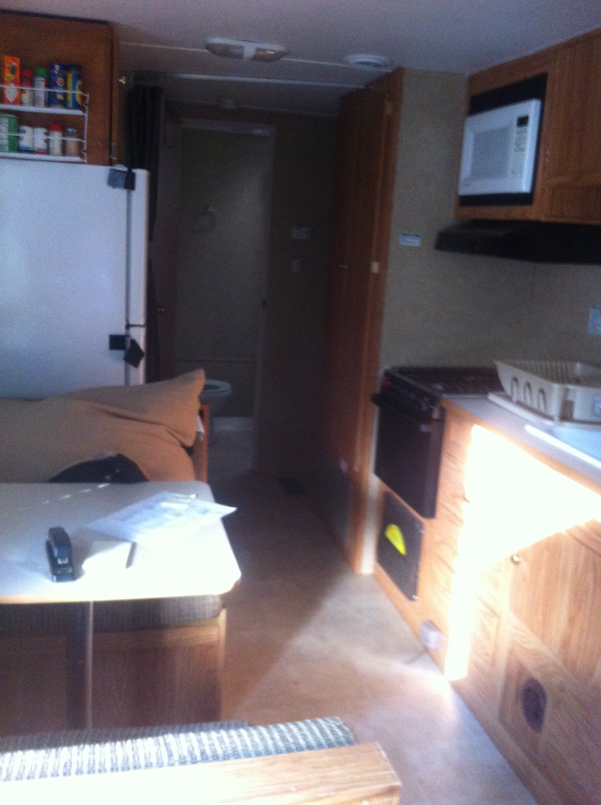 The FEMA trailer sits behind Mama & Papa’s house. Bought at an auction after its displaced residents no longer needed it, the outside looks what I imagine it looked like while being used as temporary housing after Hurricane Katrina demolished New Orleans in August 2005. The inside, however, has been outfitted with some custom woodwork and a few of Papa’s special touches to create a mighty fine fishin’ trailer. In fact, on the table is Papa’s computer-generated shopping list of supplies he’ll need for the next fishing trip.