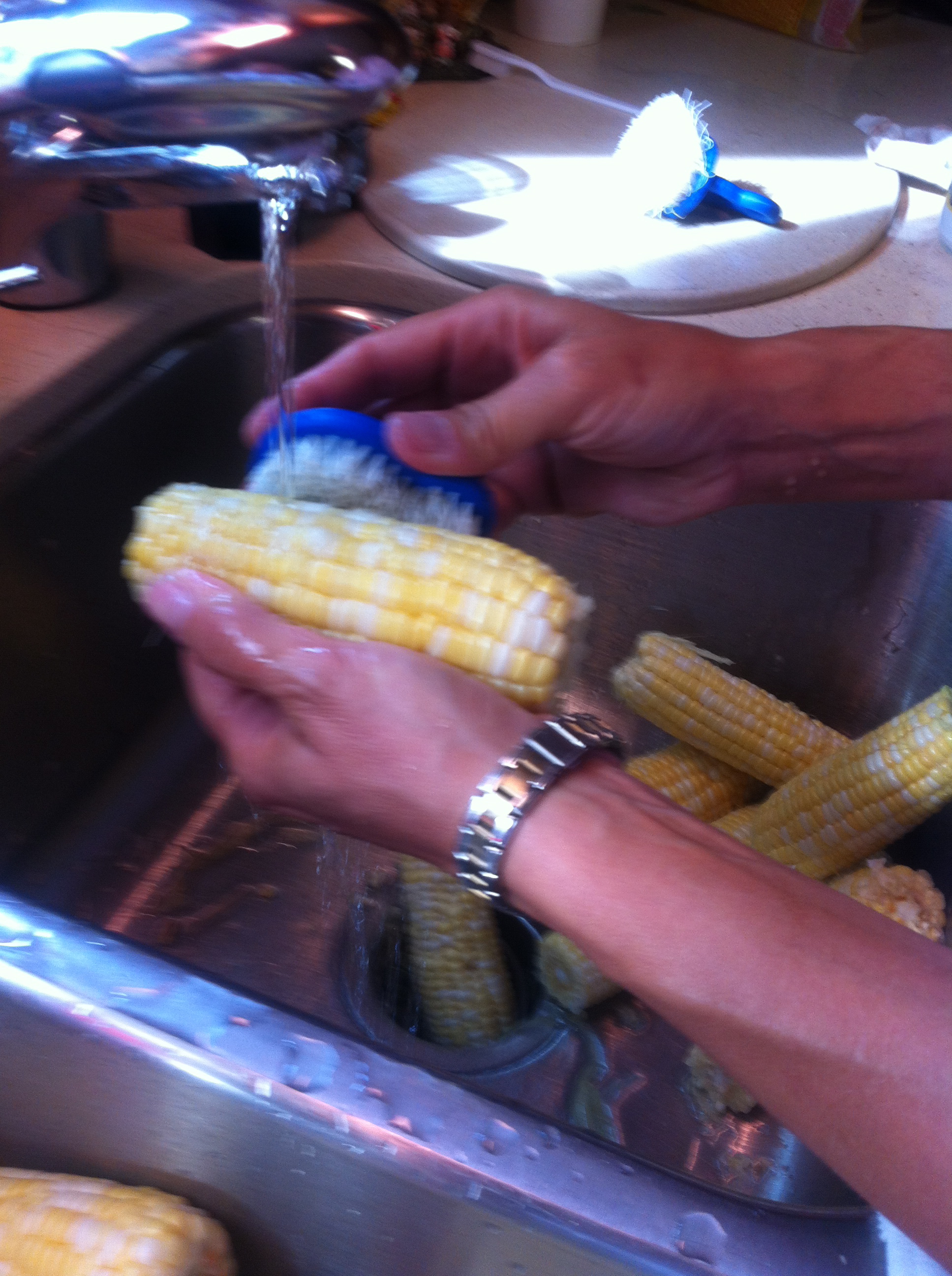After the shucked corn is toted inside, it’s got to be meticulously washed. First the sink is scoured, then each and every ear is scrubbed and de-silked under hot water. While this step is the most laborious part, you know this germophobe loved it.