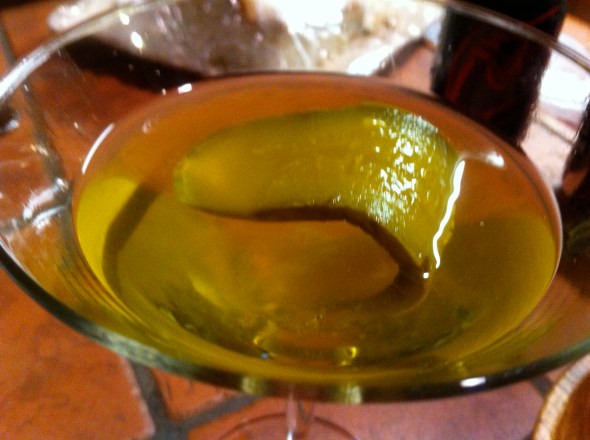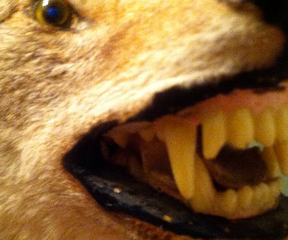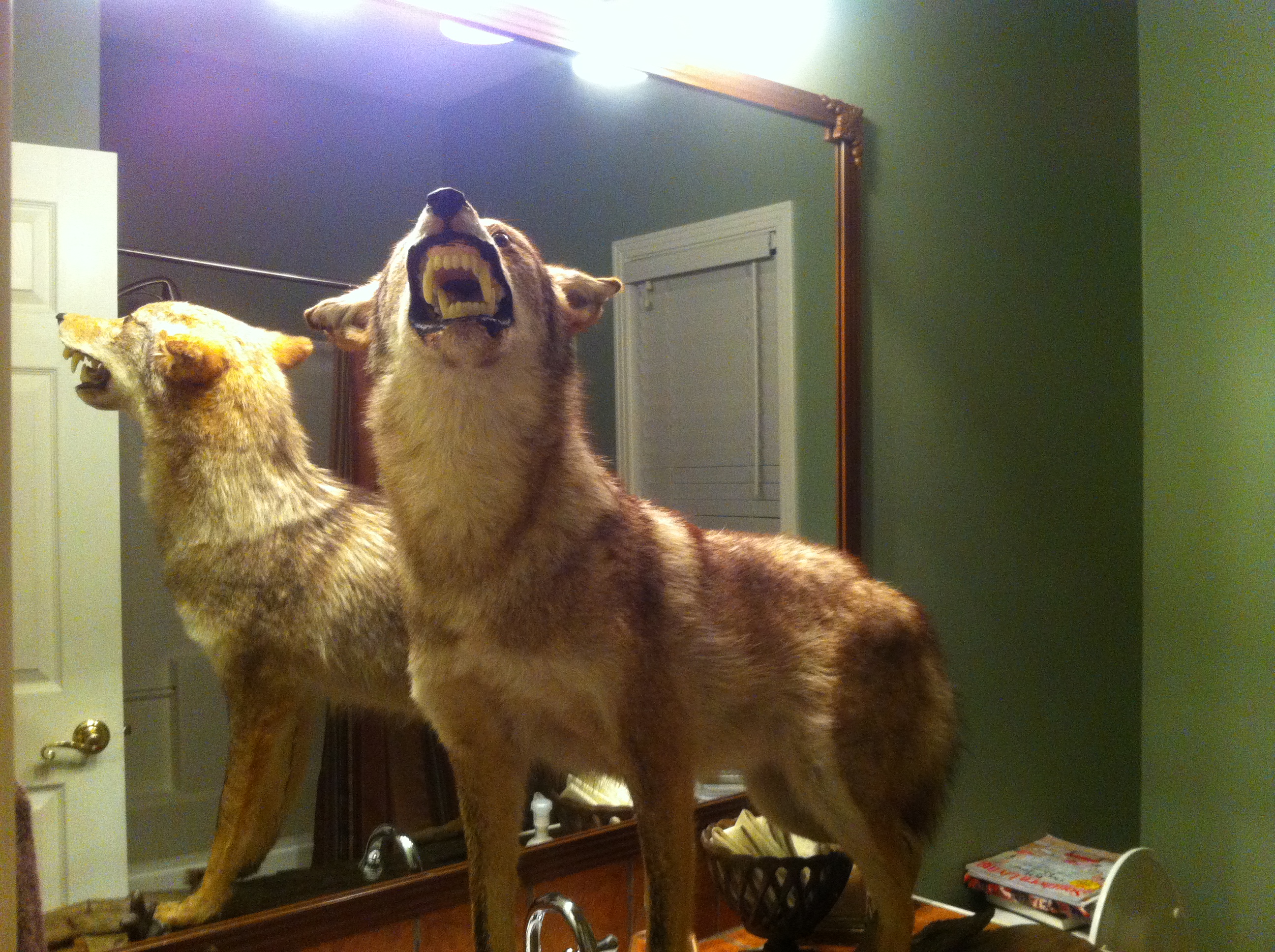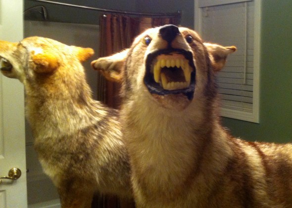 I can only surmise that the proliferation of adult beverages, including this delicious dill-pickle martini, is responsible for my less-than-creeped-out reaction to finding a snarling coyote on the vanity.
