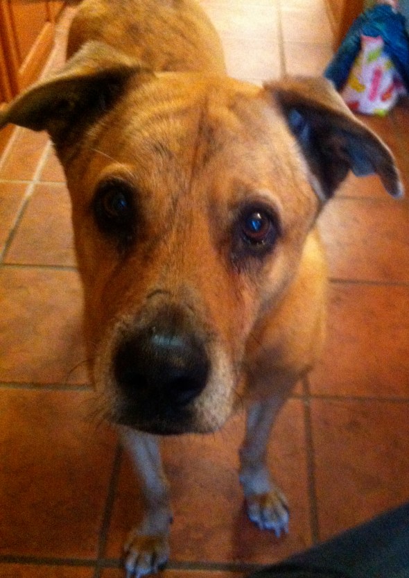 There’s Brown Betty, who’s in charge of the pack. Don’t let that sweet face and those soft brown eyes fool you — she rules her pack with an iron fist, but I like to think she imparts her authority with love not tyranny. She had the good sense to show up at Wendy’s house, and the agreement was to foster her for a few weeks while Sister Holly found her a home. Sister Holly also has a soft spot for stray dogs who could easily star in the Island of Misfit Toys. In fact, we’ll now refer to Sister Holly as King Moonracer.