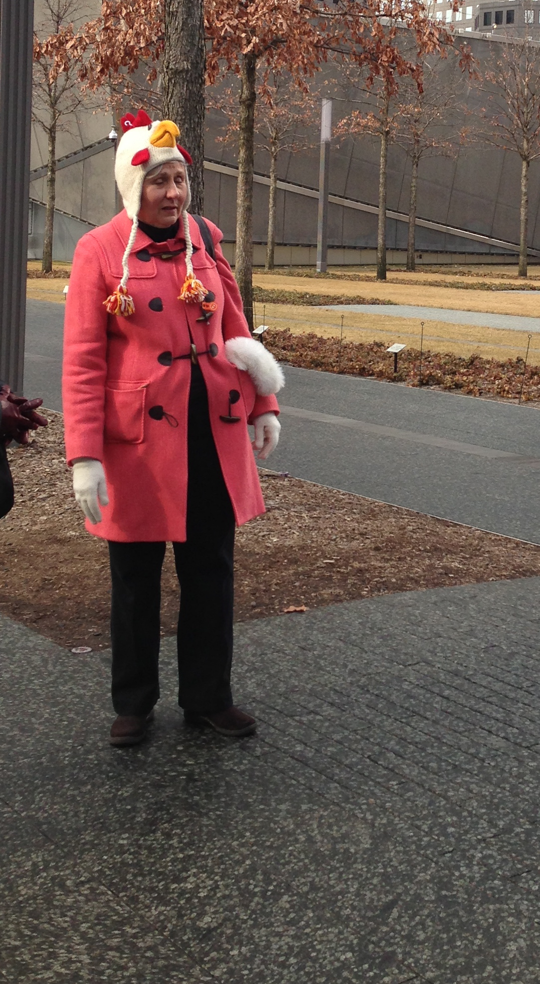 I’m still digesting the gravitas of the memorial itself, and will save the images for a later post in hopes that the words to describe the somber scene will come. For now, you must be content with the lady in the chicken hat.