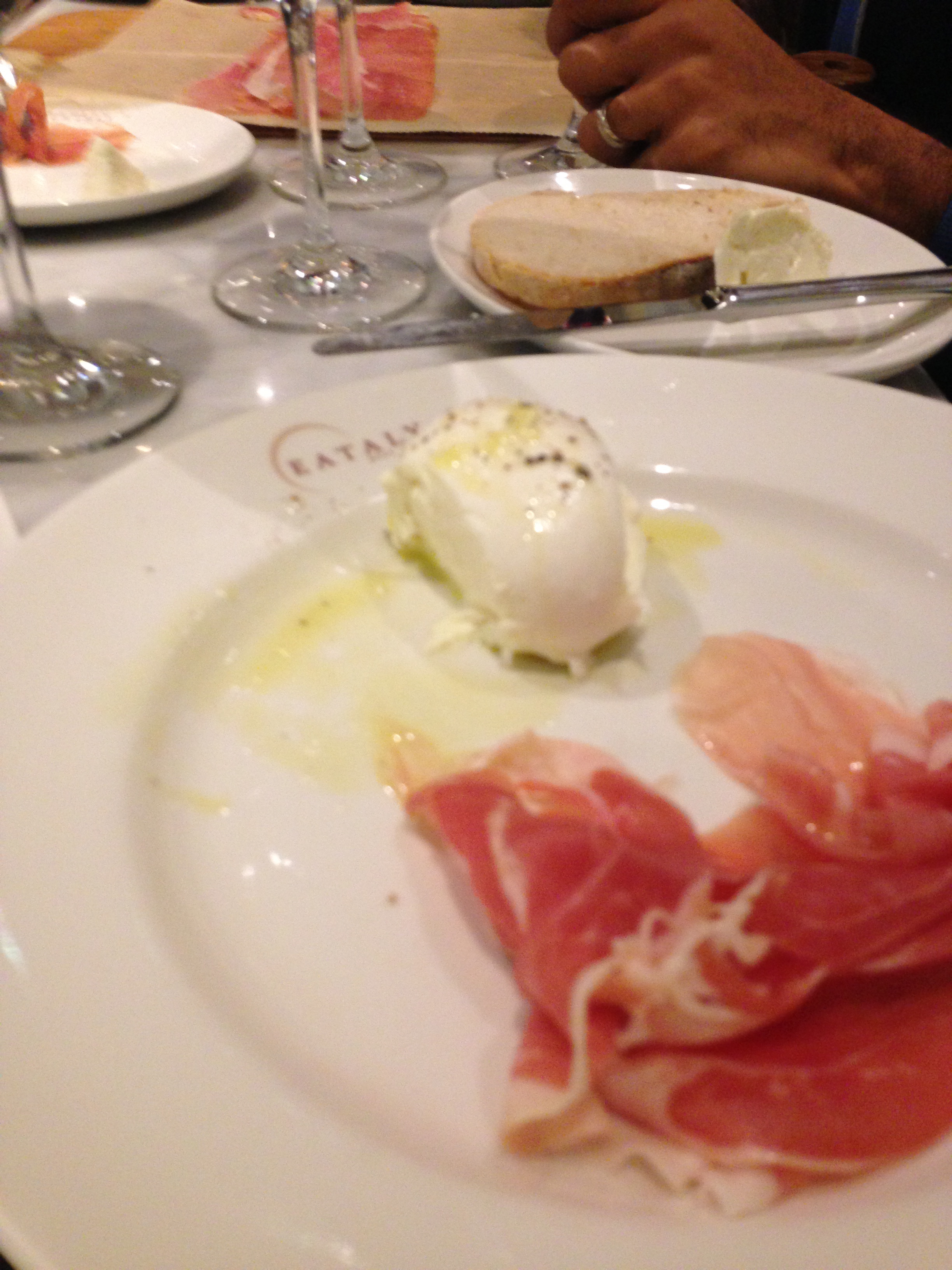 Dinner that night was at Eataly, the super fun Italian marketplace/restaurant. Part gourmet market, part wine bar, part bakery, part restaurant, Eataly adds up to a lot of fun. We shared a stand-up table with two young Indian couples on a double-date and enjoyed a bottle of wine and house-made mozzarella. (Don’t ask me about the prosciutto; that was Y’s department.)