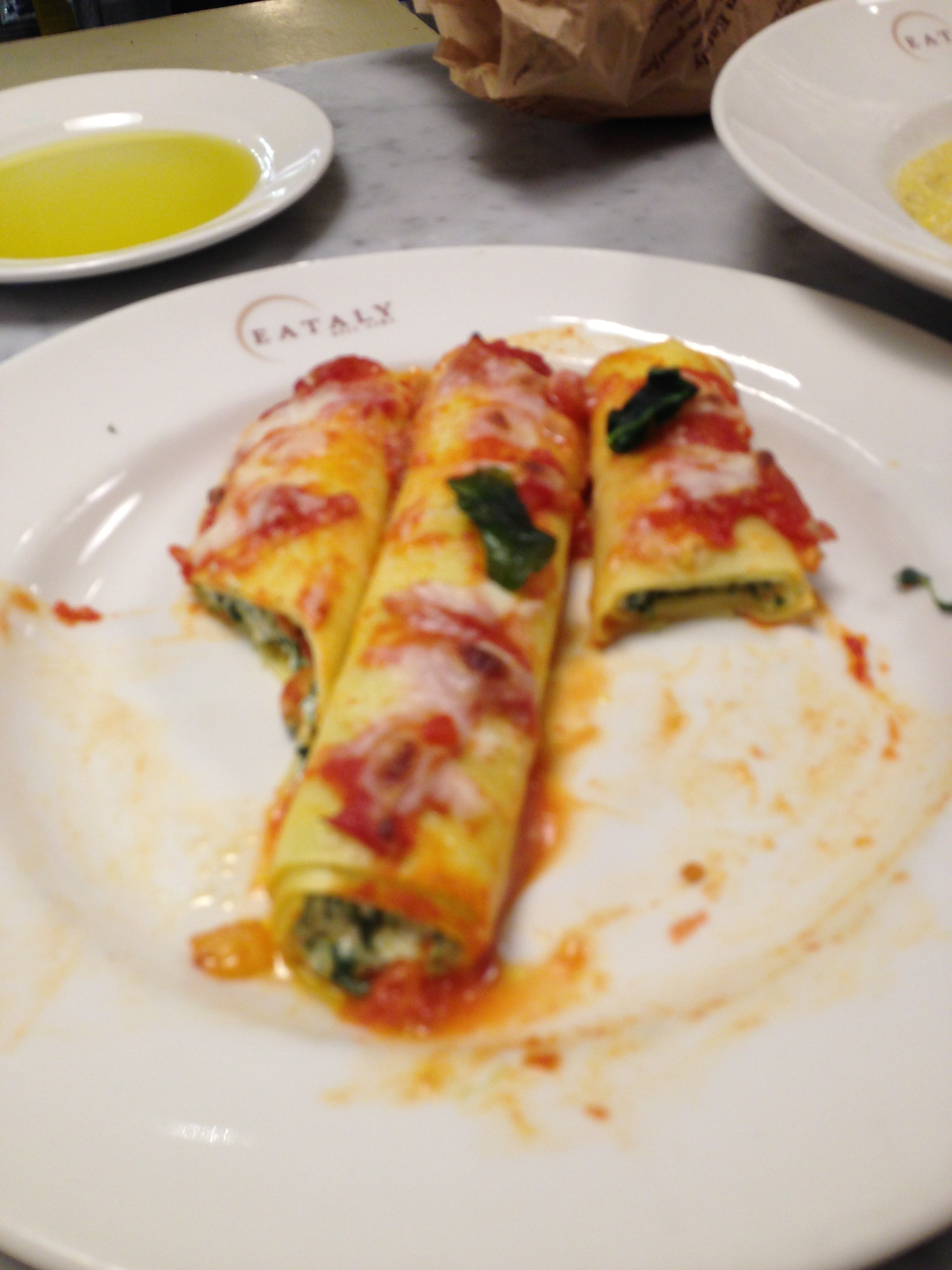 After exploring the market and checking out the nightly specials in the various sections of the restaurant, we settled on two items from the vegetarian section: a polenta topped with chick peas and sautéed swiss chard, and a spinach & ricotta canneloni. News flash: yum.