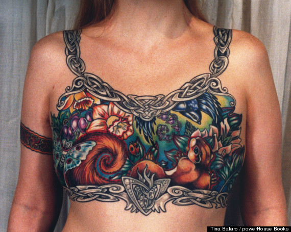 Inga had this tattoo done after her bilateral mastectomy. She and her tattoo artist were featured in a documentary in 2001 called MSNBC Investigates: Tattooed Women. She was very nervous about being on the show but felt it was important for other women — both those affected by breast cancer and those who have so far managed to evade diagnosis — to see this option to reconstruction. Inga was also featured in the book Bodies of Subversion: The Secret History of Women and Tattoos.
