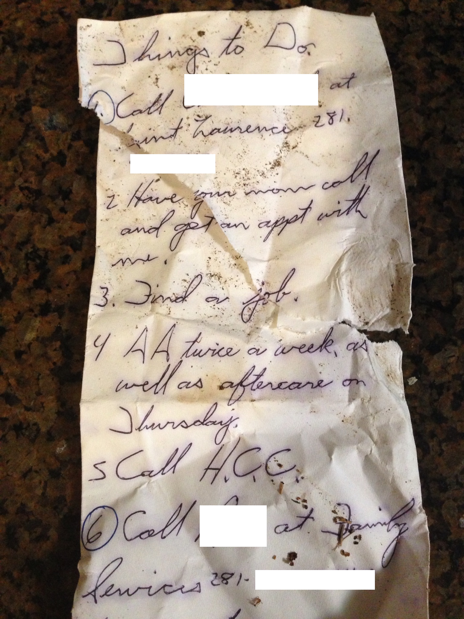 This is an important list. I really wish I knew to whom it belonged, so I could return it. Judging by the seriousness of the items on the list, I think its owner may need it.