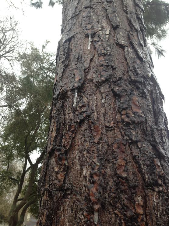 A few icicles clung to the pine tree.