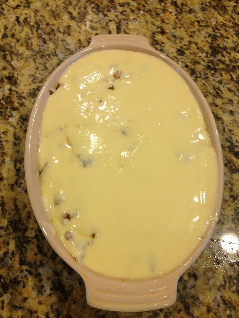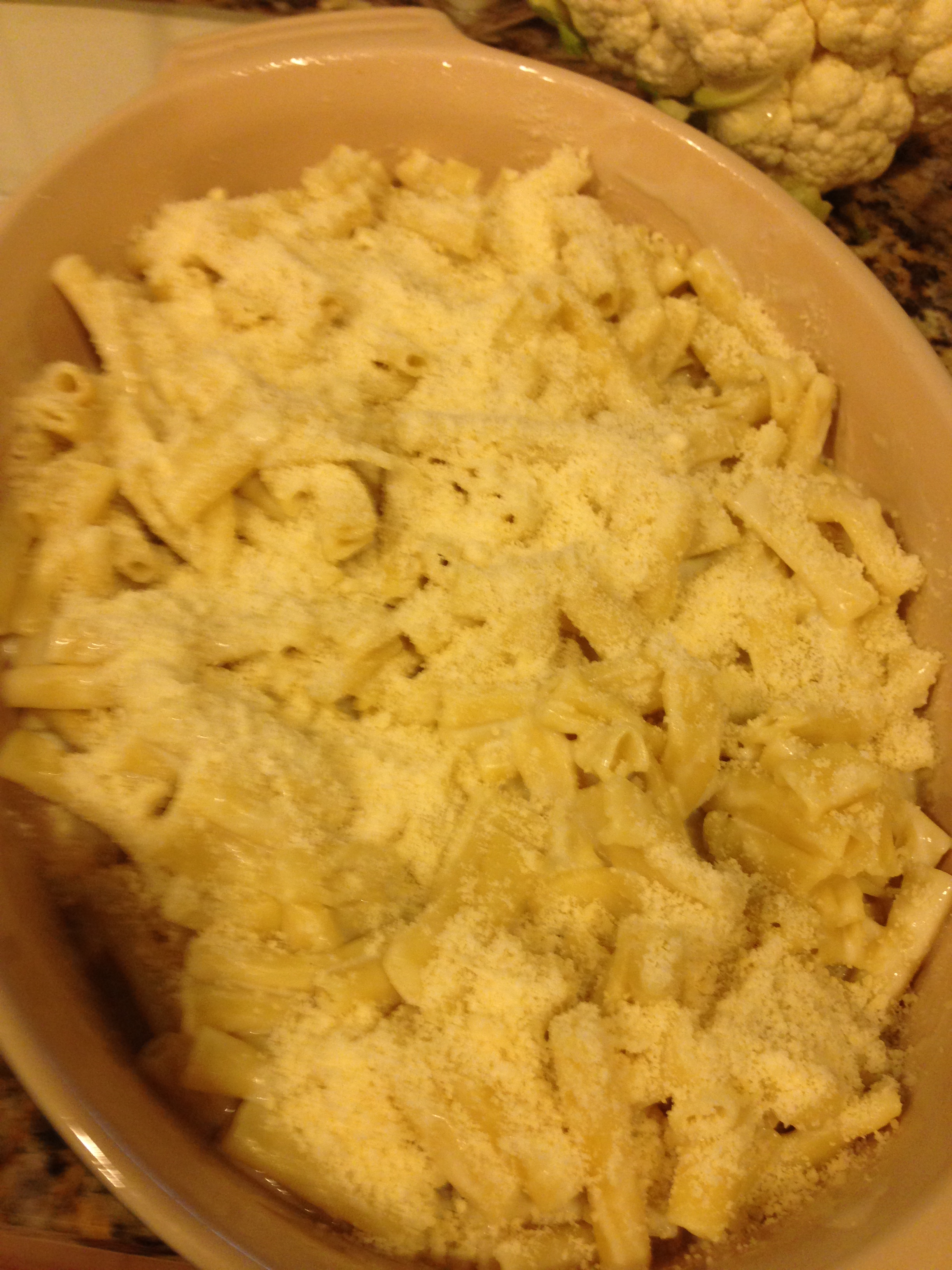 When the “thin” sauce is done and the pasta has cooked, start assembling: cooked pasta in a buttered casserole dish, then top with the “thin” sauce. Top that with copious amounts of Romano cheese. When in doubt, add more cheese.