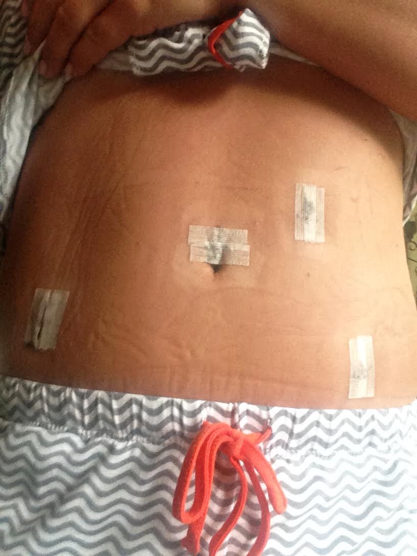 I’ve got four incisions on my belly: three were for the surgical instruments and one for the camera. I had just woken up yesterday when I snapped this selfie, so the lines traversing my belly are from sleep.