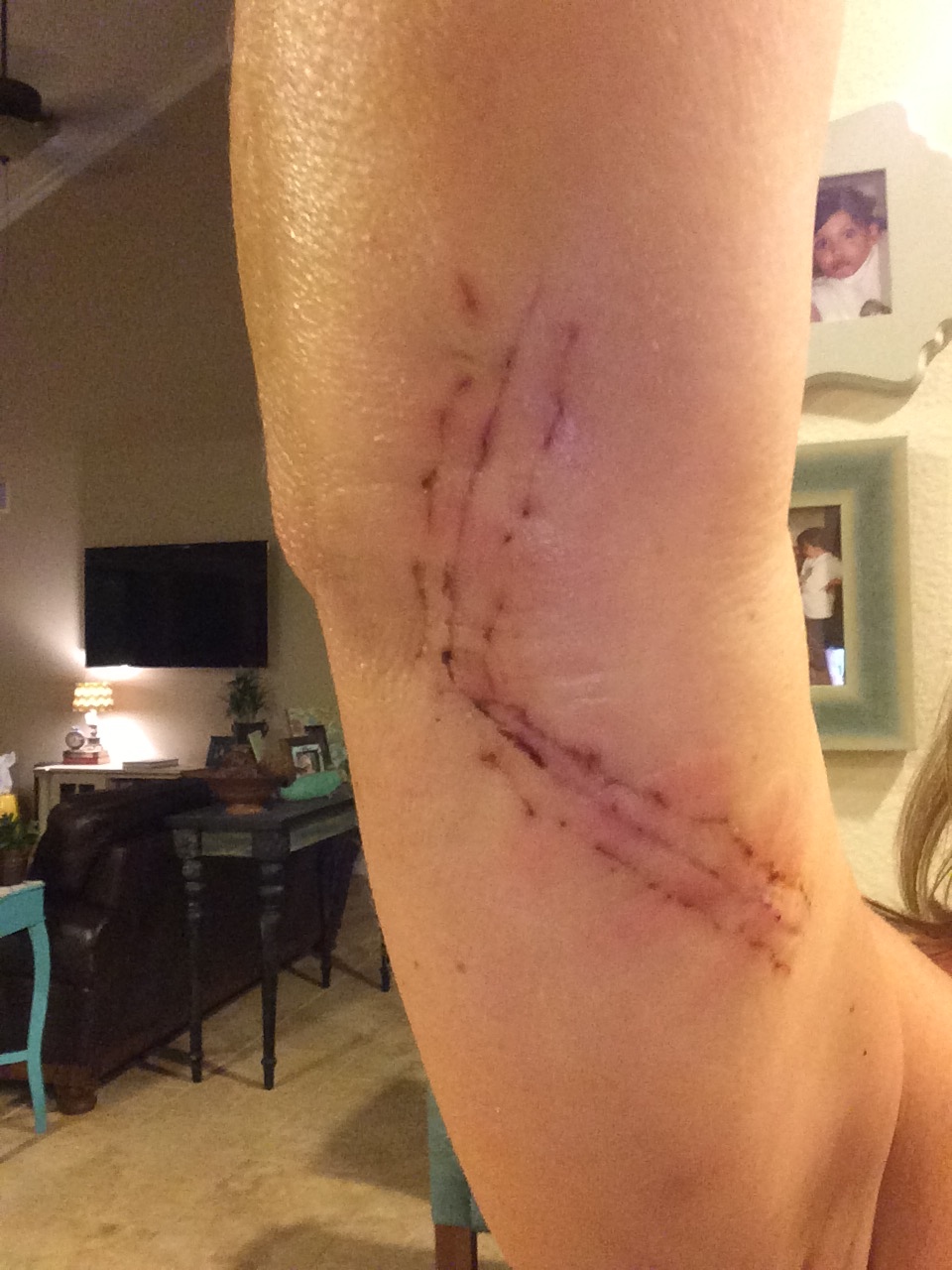 Long story short, the ulnar nerve (which runs from one’s neck to fingertip) becomes dislodged and gets caught on the bony ridge of one’s elbow when one stretches or bends at the elbow. Once dislodged, the nerve needs help getting back in the right place. So, my surgeon had to dig a new channel for my ulnar nerve to lie in, then stitch the nerve into the muscle to ensure that it didn’t go rogue again. It was as pleasant as it sounds (not really pleasant at all). And the scar is about as pretty as you might expect (not really pretty at all). It’s a good conversation piece, though; I’ve been asked more than once if I had Tommy John surgery (do I look like a baseball pitcher?) or whether I won the knife fight. IMG_3837