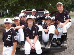 It’s a good reminder to be careful what you say, too, because I joked with Corey about P having gotten his mad baseball skills from my side of the family. While it’s true–my dad’s baseball career started with PeeWee ball in 1948 and ended with him playing for the University of Tulsa–I was being smart-aleky, and Corey not only took it seriously but also included that in the article! I certainly don’t want to sound like one of “those” baseball moms. I think my kid is a good player who happens to have some natural athletic ability and a body built for taking some hard knocks. However, I’m under no illusion that he’s going to play ball for a living when he grows up, and his *$#& most definitely stinks.