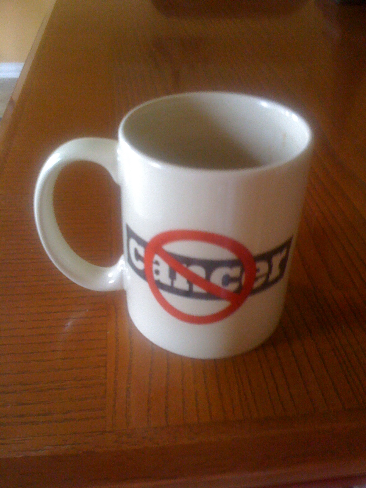 an apropos coffee mug for my cup of Joe (the photo is small but the mug says “cancer” with the red circle & slash mark,
