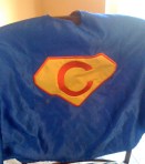 Also appropriate is that Amy Hoover showed up on my doorstep last night with a real-life superhero cape, which I clearly need to continue this “journey.” She doesn’t need a cape, because she really is a superhero, but her youngest son, Carter, has one and was sweet enough to loan it to me. We’re changing the C for Carter to C for Cancer-killer. I love the cape.
