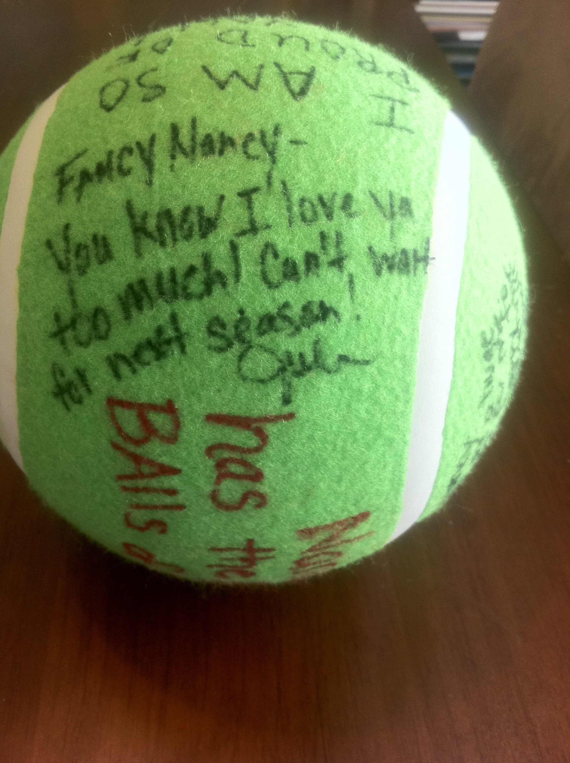 My tennis team’s luncheon was already planned, but how fun to celebrate my big news with some of my favorite girls? And how cool that they gave me a huge, signed tennis ball? Thanks, girls!