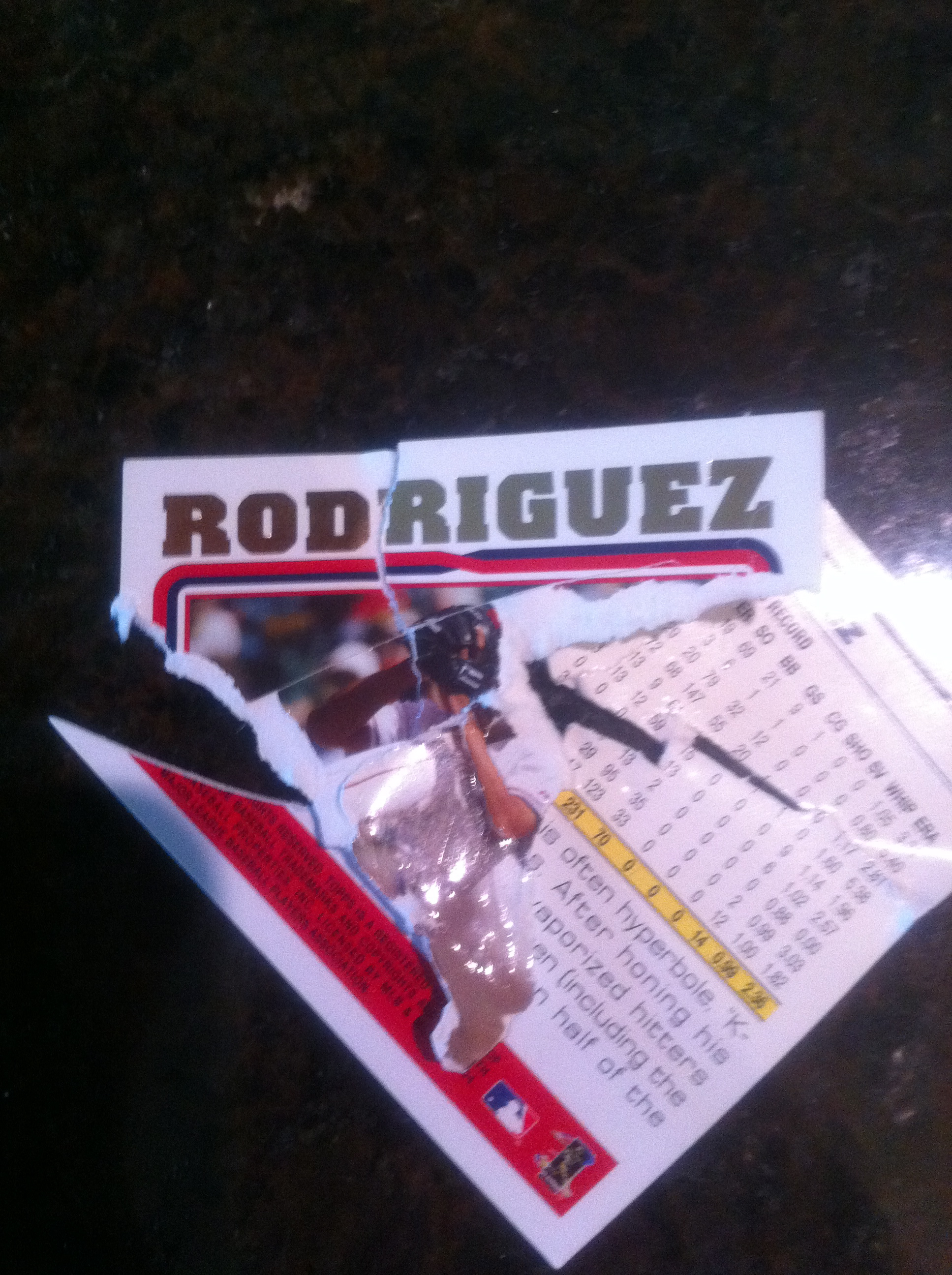 An A-Rod baseball card, chewed to bits by our little dog Pedey. I love it! It’s even funnier because that little dog is named for Payton’s favorite Red Sox player, Dustin Pedroia. The idea of Pedey going after A-Rod fills my heart with pride. I’ve said before that Pedey is not much like his namesake: he’s lazy and clumsy with a ball, but in this case, Pedroia would be proud of this little dog for pouncing on A-Rod and tearing him to bits!