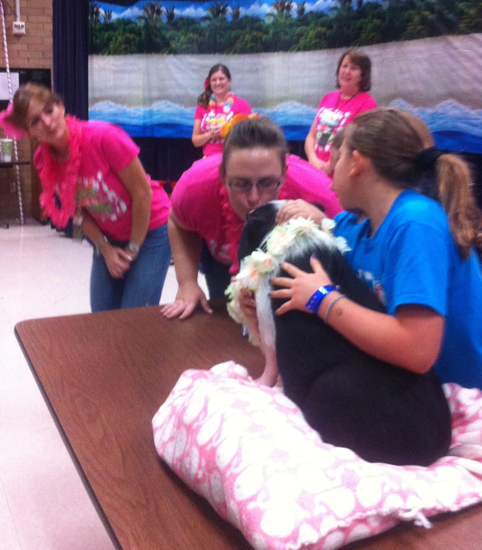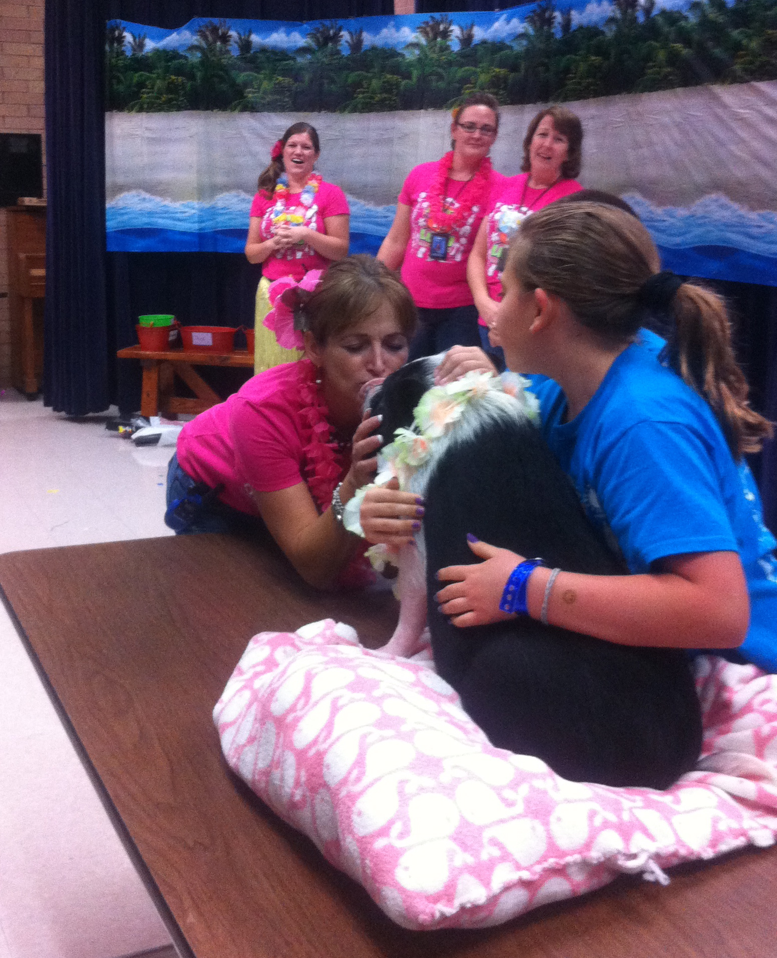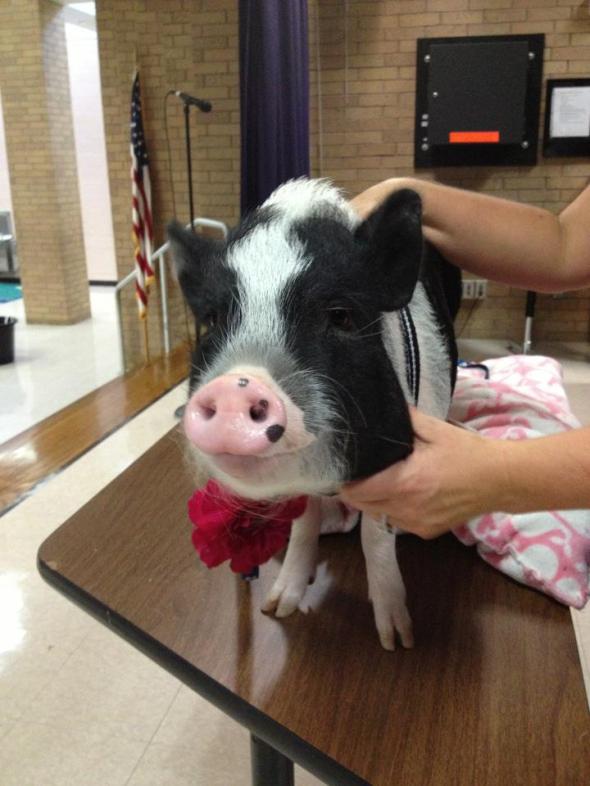 The big winners were announced live, at the fundraiser, and the crowd was whipped into a frenzy. The kids were chanting, “Kiss the pig!” and screaming, parents were straining to catch a glimpse of the pig on the stage, and cameras were flashing. We have a big school — nearly 800 students and close to 70 teachers & staff — so the crowd was Texas-sized. Piper took her rock-star experience in stride, calmly munching on cucumber slices and wasabi peas as the crowd adored her. In keeping with the luau theme of the fundraiser, she sported a hibiscus leash and a lei around her neck.