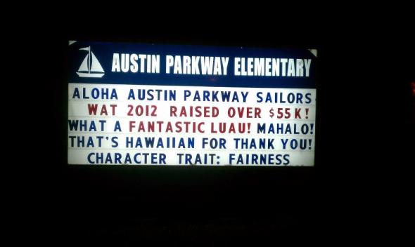 Our little piggie helped raise $928.56 for the school, and the grand total earned was $55,000. Here’s the school marquee lit up in the wee hours of the night, after all the money had been counted.