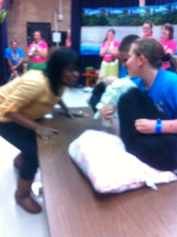When it came time for the kissing, the teachers came on stage one at a time and got up close and personal with Piper. Sadly, it went by so fast I didn’t get a picture of each teacher. By the time I got my camera ready, we’d blasted through the kindergarten, first and second grade teachers puckering up with Piper. Here’s the third grade winner giving Piper a big smooch.