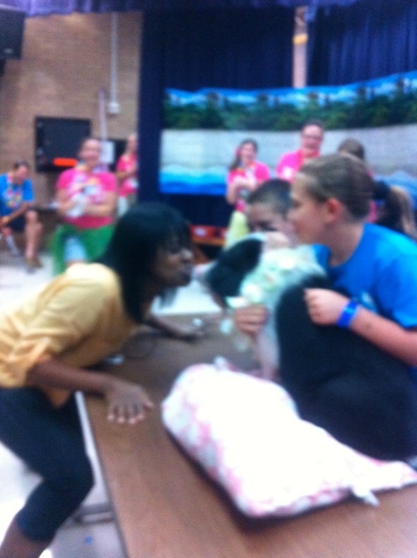 Last year our amazing Walk-a-Thon chairlady Amy came up with a brilliant idea for another element for fundraising: Kiss the Pig. At that point, we didn’t yet own our little piggie, so Amy rented a piglet from a petting zoo. That may have turned out be the longest 24 hours of her life: that poor piglet had not yet been weaned from its mama and bawled like the baby it was.