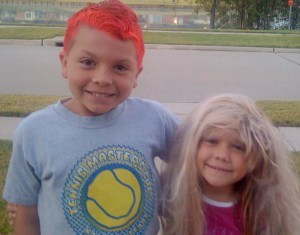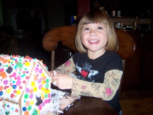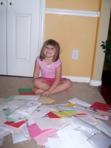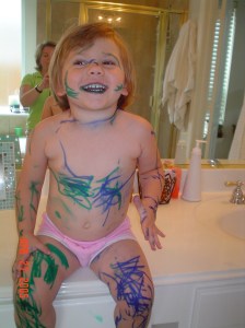 This was a common sight at our house in her early years. In this particular instance, she decorated herself while I was talking to a workman in our new house about some warranty repair issues. The guy was in his 20s, unmarried without kids, and he about had a heart attack when she appeared on the scene like this. I asked him to wait a sec while I got my camera. After I took the photo he said, I can’t believe you stopped to photograph her; I thought you would spank her or something. I shook my head and said, spanking a true artist is futile and only makes your hands hurt.