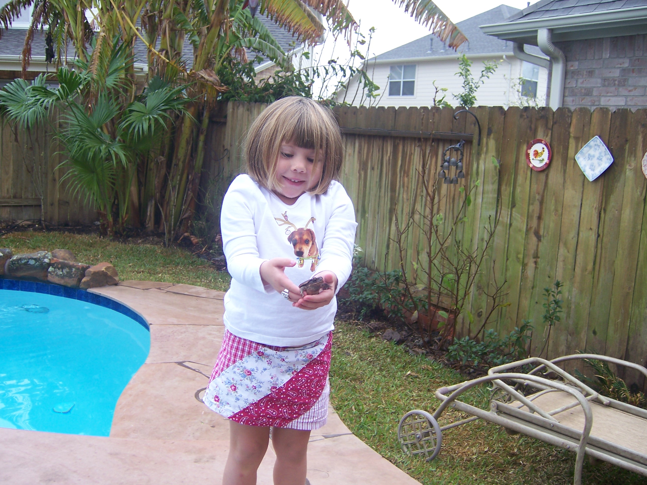 Not long after the pool was finally finished, Macy found a little frog swimming in, but trying to get out of, the pool.